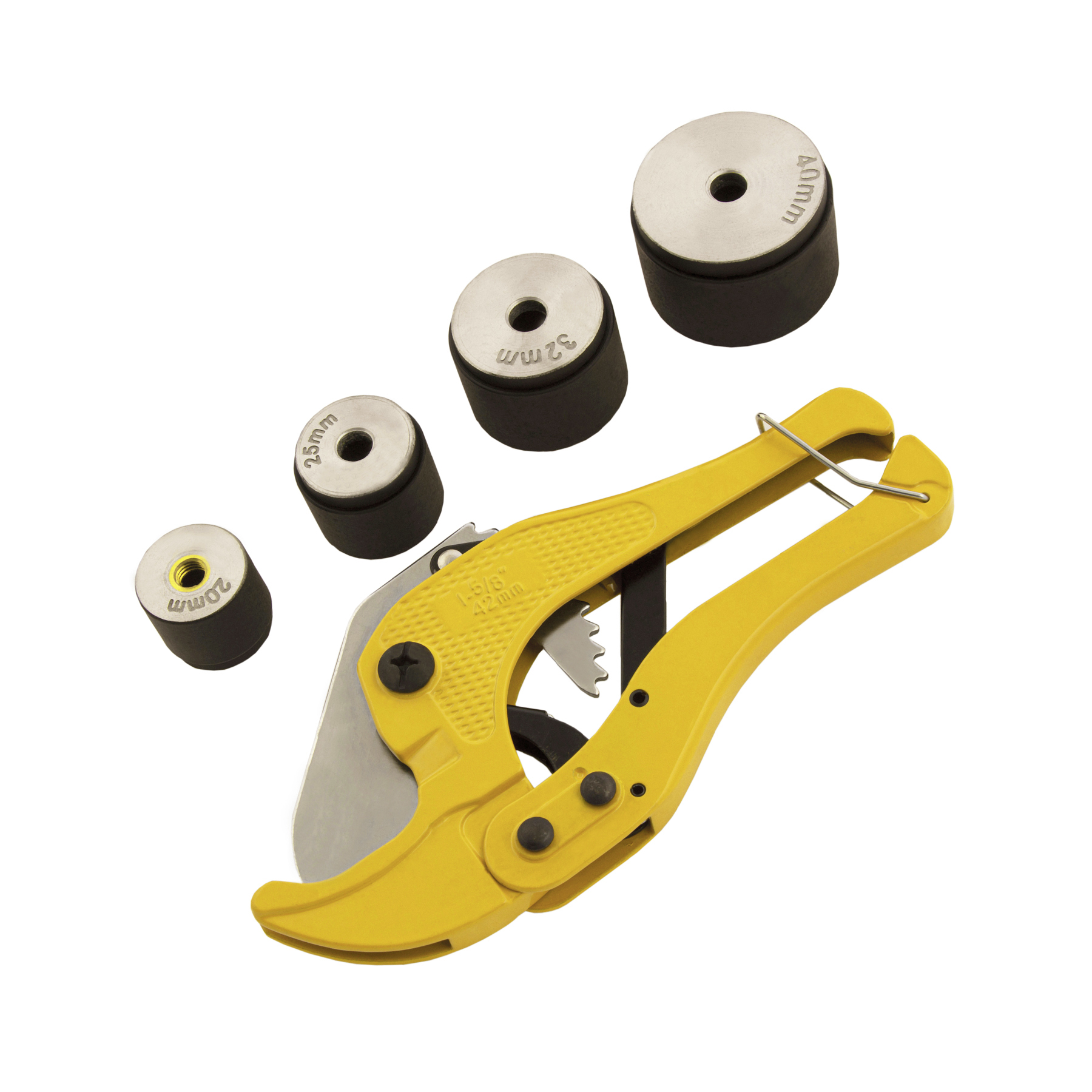 - Широкий комплект поставки — к аппарату прилагаются 4 насадки для соединения труб диаметром 20, 25, 32 и 40 мм, имбусовый ключ и труборез.