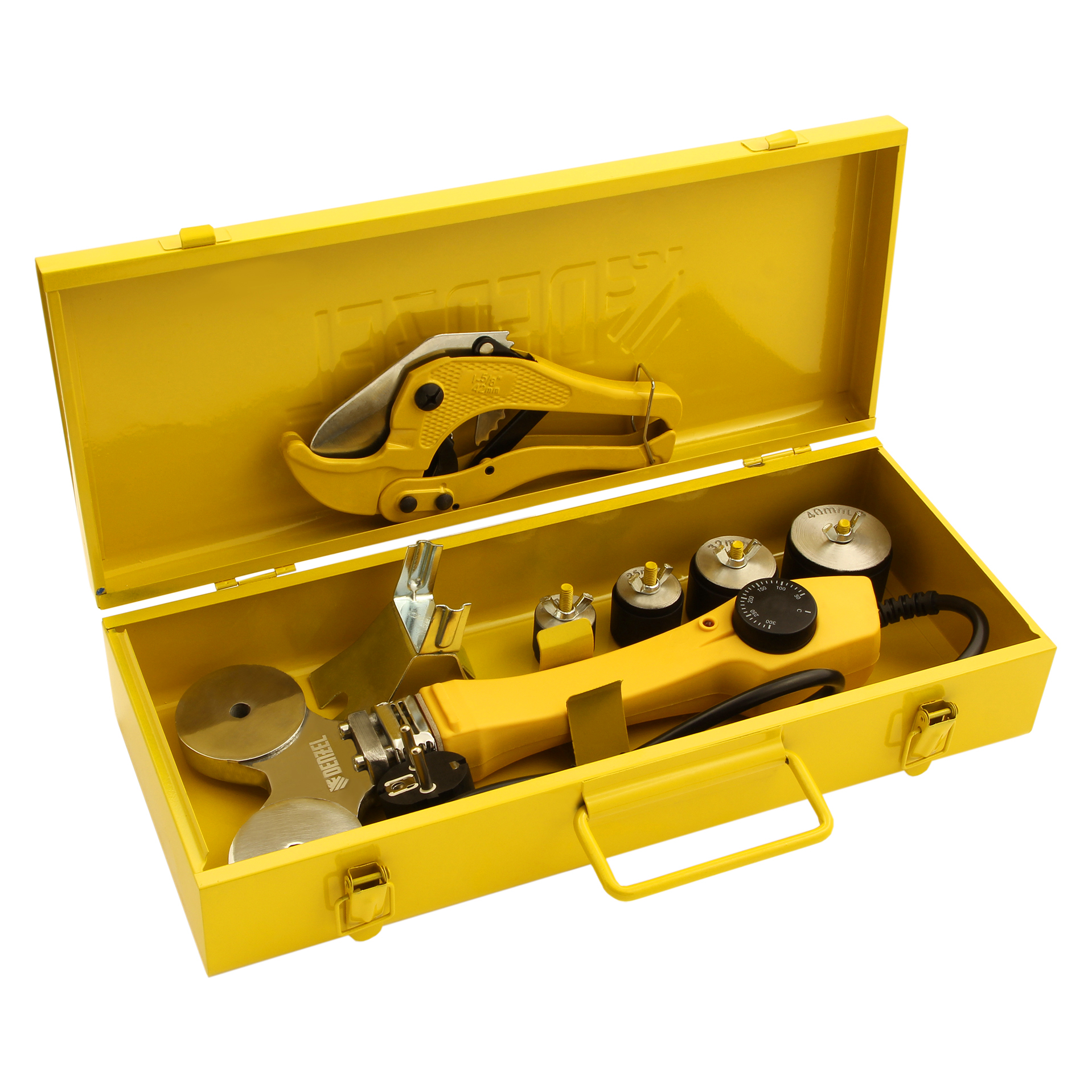 Аппарат для сварки пластиковых труб - 1 штИмбусовый ключ - 1 штТруборез - 1 штМеталлический кейс для хранения - 1 штПарные сменные насадки - 4 штРуководство по эксплуатации и гарантийный талон - 1 шт |