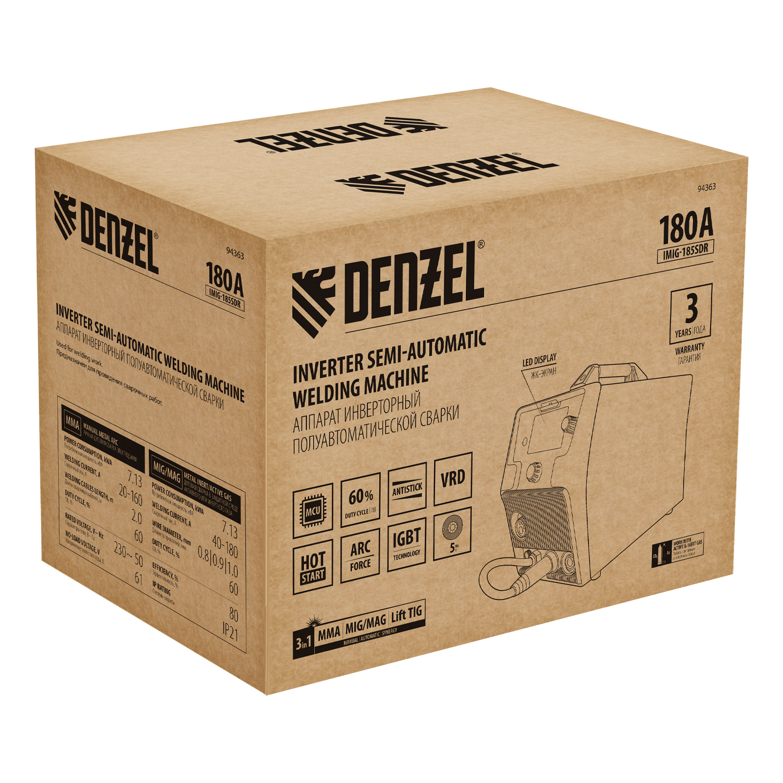 Аппарат инвертор. полуавтомат. cварки IMIG-185SDR, 180 А, ПВ 60%, катушка 5 кг Denzel в Екатеринбурге