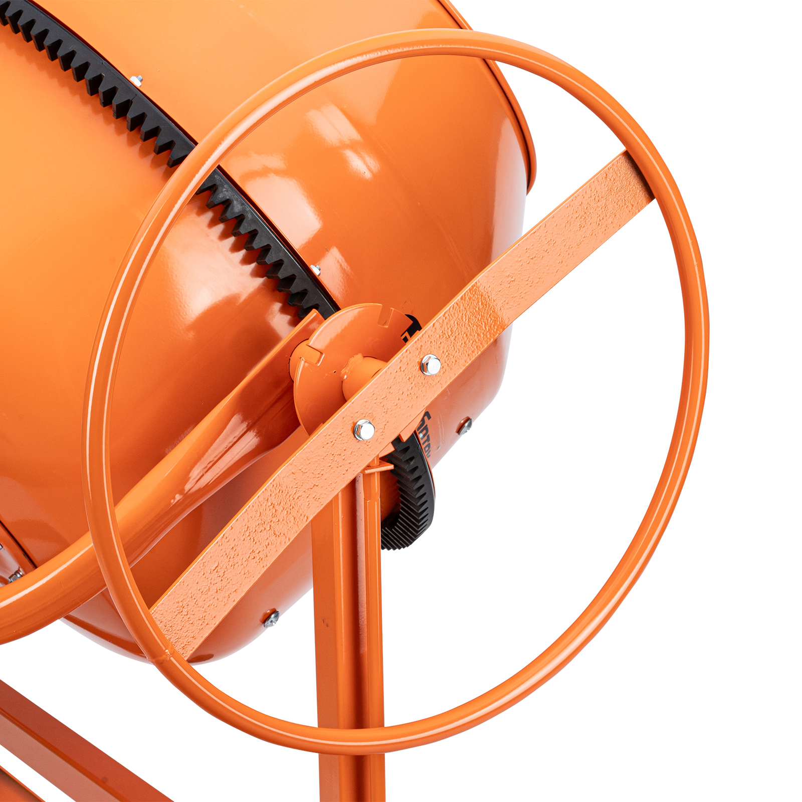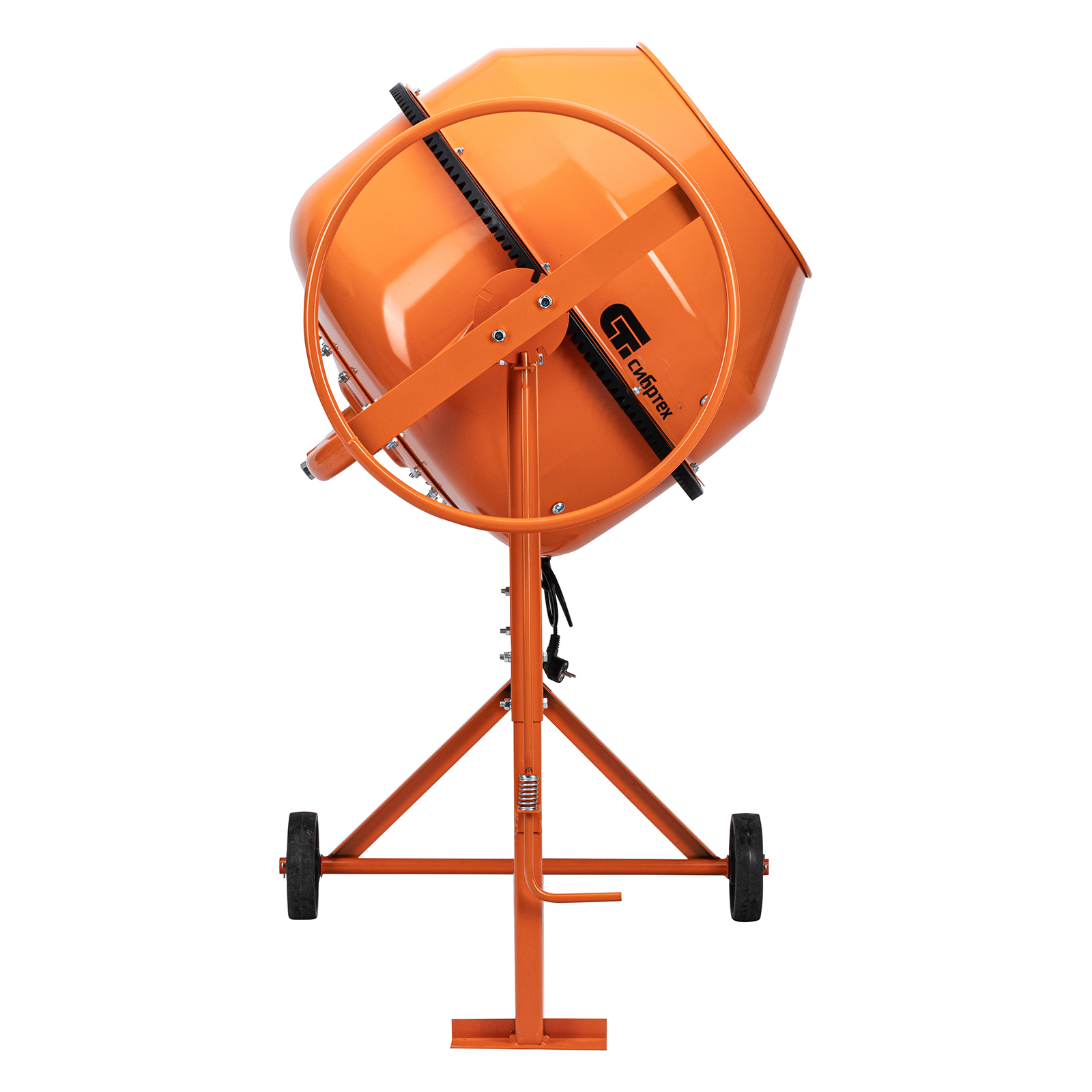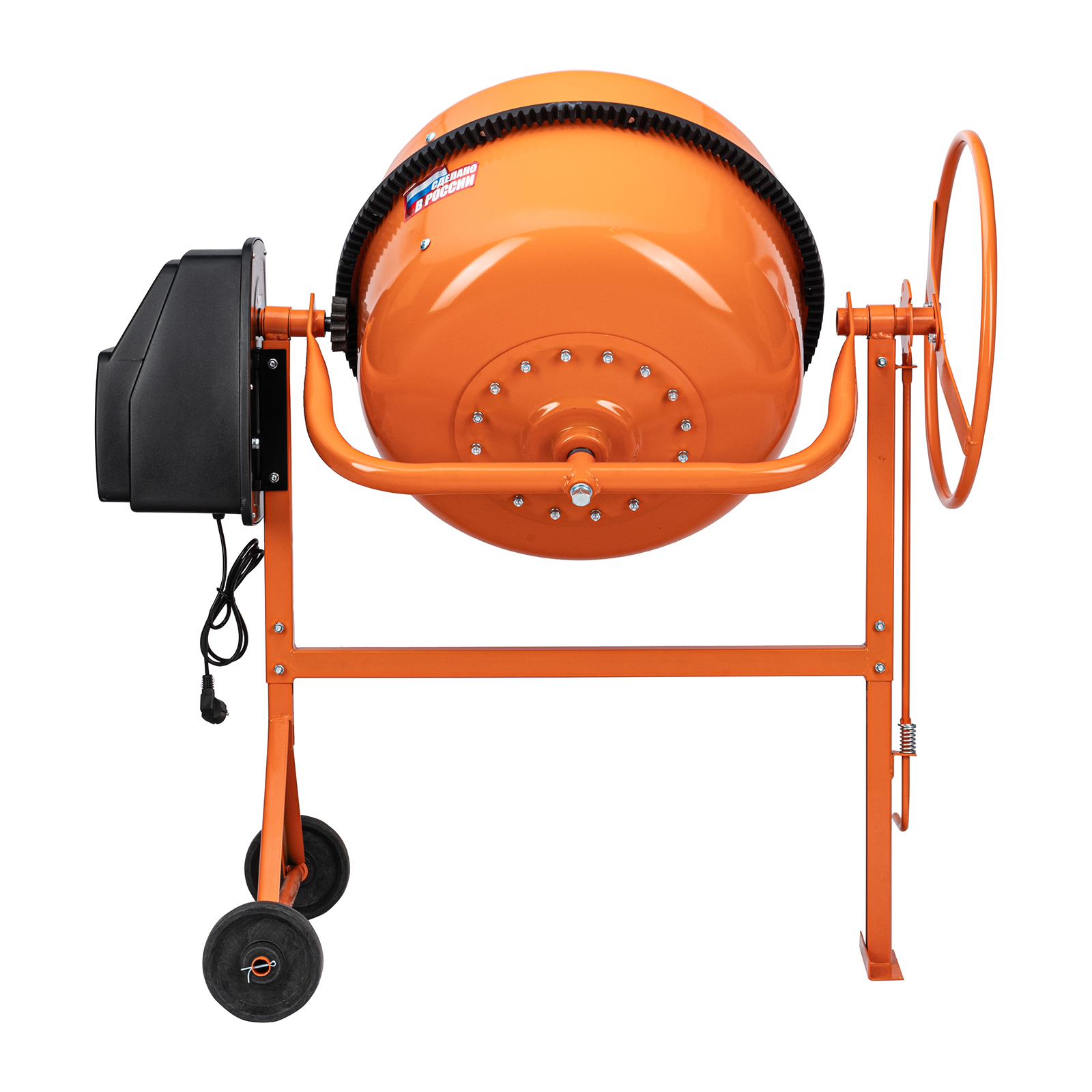 - Удобная загрузка и выгрузка смеси — барабан наклоняется при помощи маховика и легко фиксируется в нужном положении.