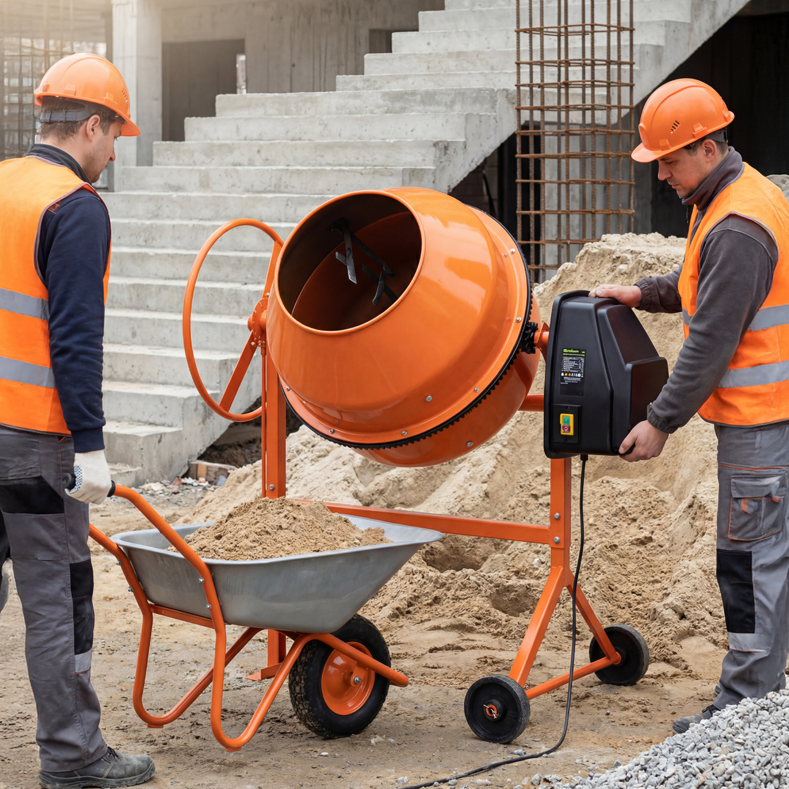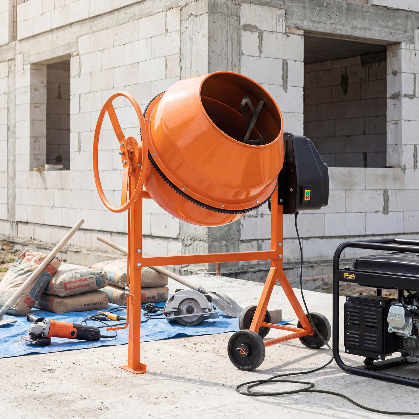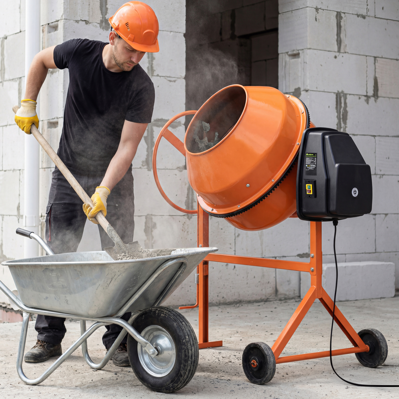 Двигатель мощностью 700 Вт обеспечивает высокую производительность, при этом не создает значительной нагрузки на электросеть. Бетоносмеситель пригодится для проведения строительных работ небольшого объема.