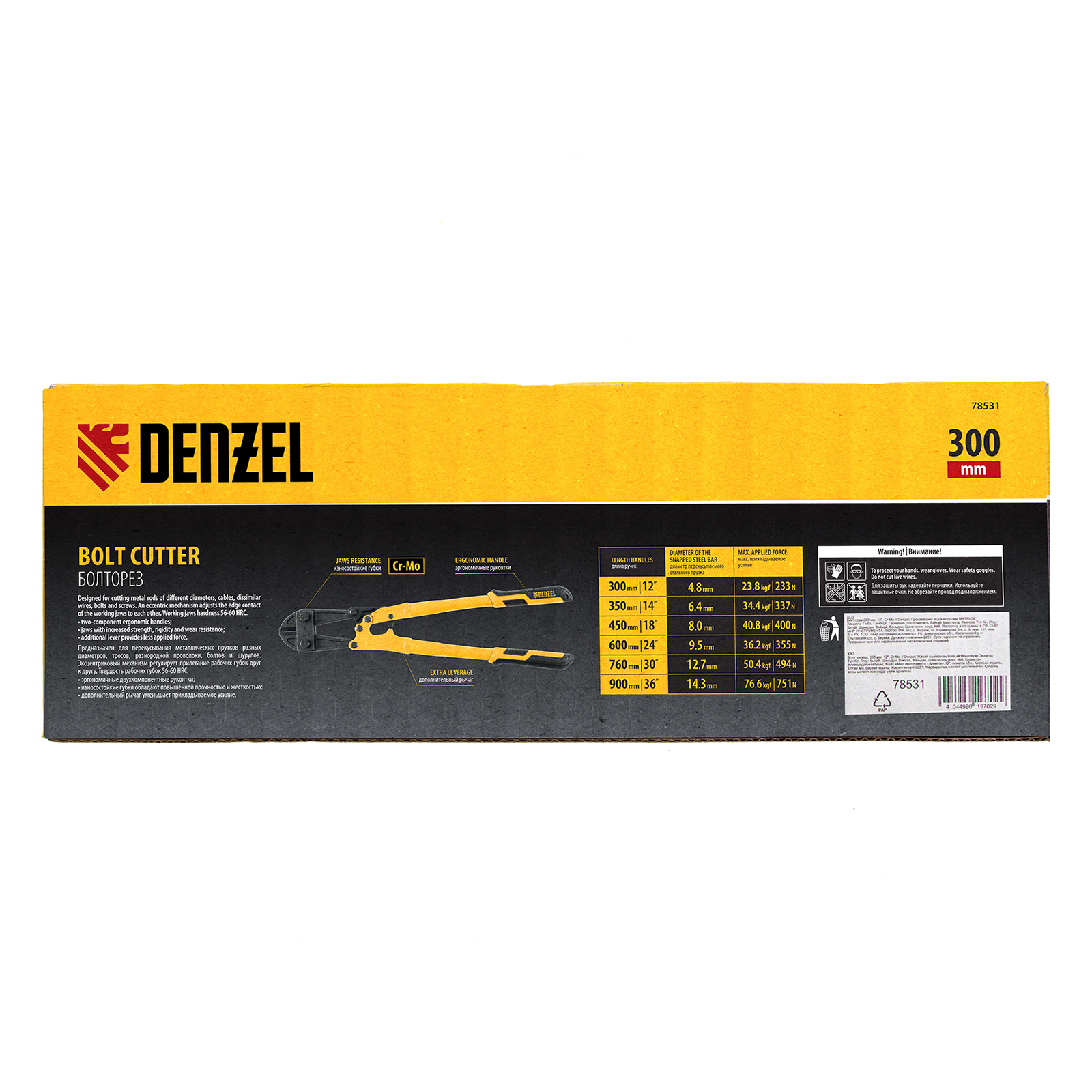 Болторез Denzel 78531 длиной 300 мм (12 дюймов), из стали Cr-Mo, предназначен для перекусывания стальных прутков диаметром 4,8 мм, болтов и шурупов, тросов, разнородной проволоки.