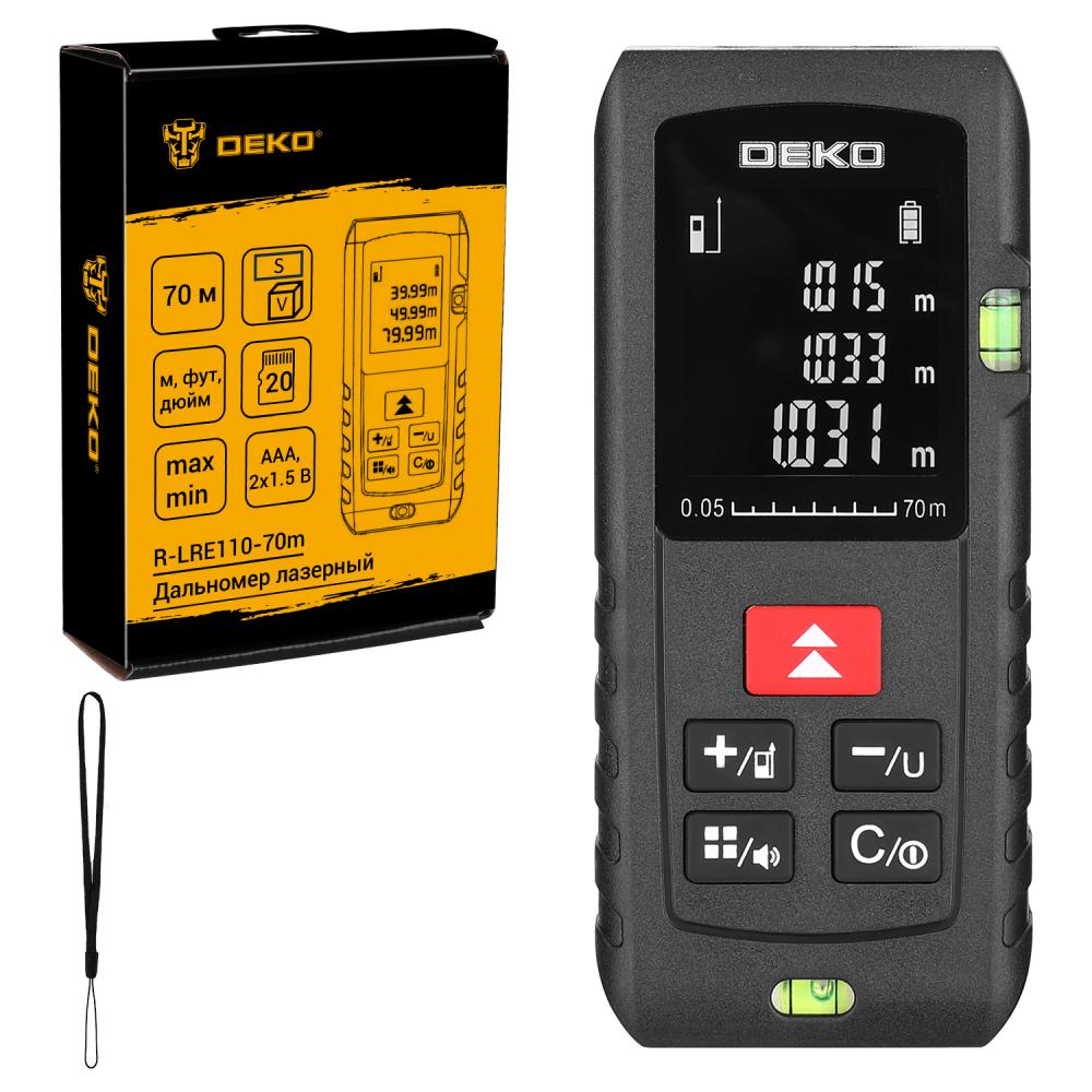 Дальномер лазерный DEKO R-LRE110-70m предназначен для проведения точных измерительных работ (измерению расстояния, площади и объема).Технические характеристики:Диапазон измерения: 70 мТочность измерения (стандартное отклонение): ± 2 ммЕдиницы измерения: м, фут, дюймЕдиницы измерения площади: м2, фут2Единицы измерения объёма: м3, фут3Тип лазера: 620~690 НмКласс лазера: IIПамять устройства: 20 записейВремя автоматического отключения лазера: 30 сАвтоматическое отключение прибора: 180 сРабочая температура: От 0°C до + 40°C Температура хранения: От -20°C до + 65 °CТип питания: AAA (щелочные), 2x1,5 В (не входят в комплект)Упаковка: коробкаКомплектация:Дальномер лазерный - 1 штРучной ремешок - 1 штРуководство по эксплуатации - 1 шт