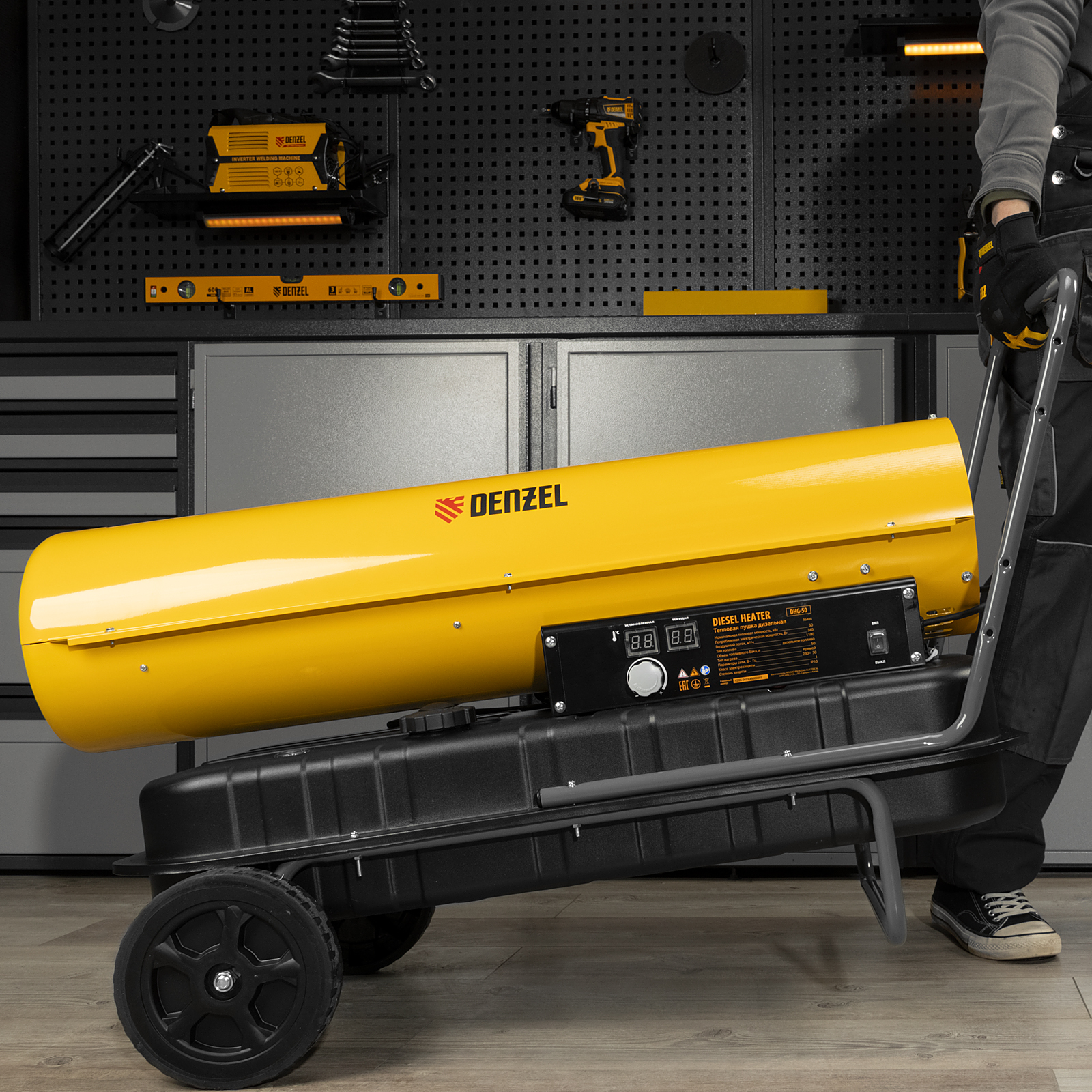 Дизельная тепловая пушка Denzel DHG-50 96486 мощностью 50 кВт и производительностью 1100 куб. м/ч предназначена для прямого нагрева воздуха в цехах, ангарах, хранилищах и других нежилых помещениях с хорошей вентиляцией. Максимальная площадь обогрева составляет 500 кв. м. Пушка служит эффективным источником тепла в полярных экспедициях. Пригодится также на строительной площадке для прогрева бетона, просушки стен и разморозки траншей. Для заправки может использоваться любое дизельное топливо: летнее, зимнее и арктическое.