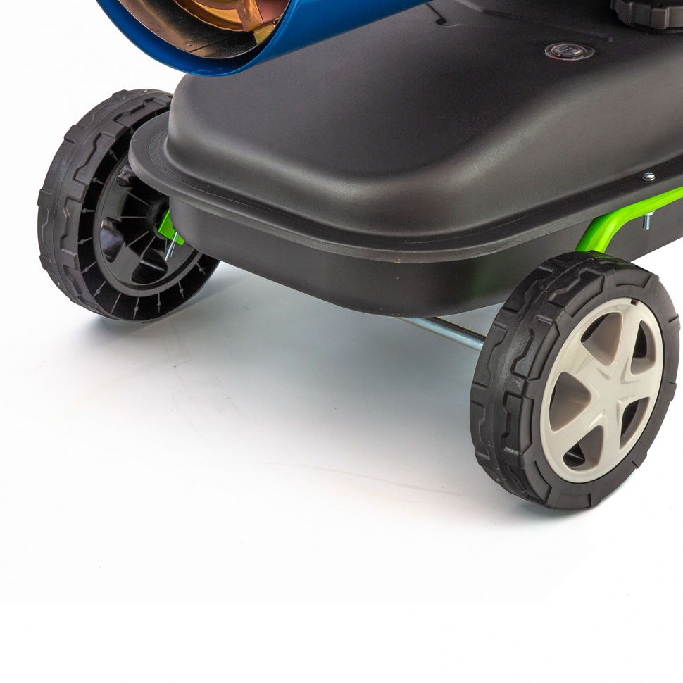 - Удобная транспортировка — благодаря подставке с ручкой и двум большим колесам пушку легко перемещать по рабочей площадке.