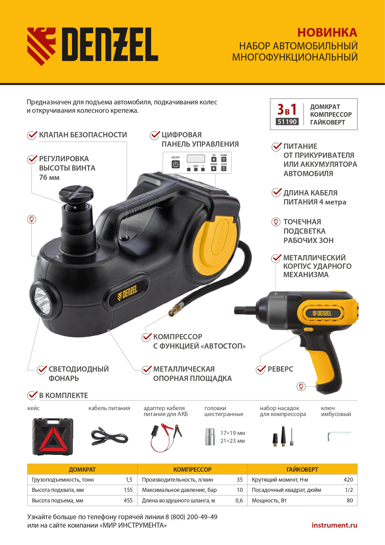 Электрогидравлический домкрат «3 в 1» Denzel 51190 в наборе с электрическим гайковертом работает от сети 12 В и представляет собой устройство для подъема грузов массой до 1,5 т на высоту 155-455 мм. Встроенный компрессор производительностью 35 л/мин служит для подкачки шин, мячей, матрацев и других резиновых изделий. Гайковерт с переключателем направления вращения позволяет откручивать и закручивать резьбовой крепеж во время замены колес. Набор будет полезен в гараже, автомастерской, также пригодится водителям в поездке.