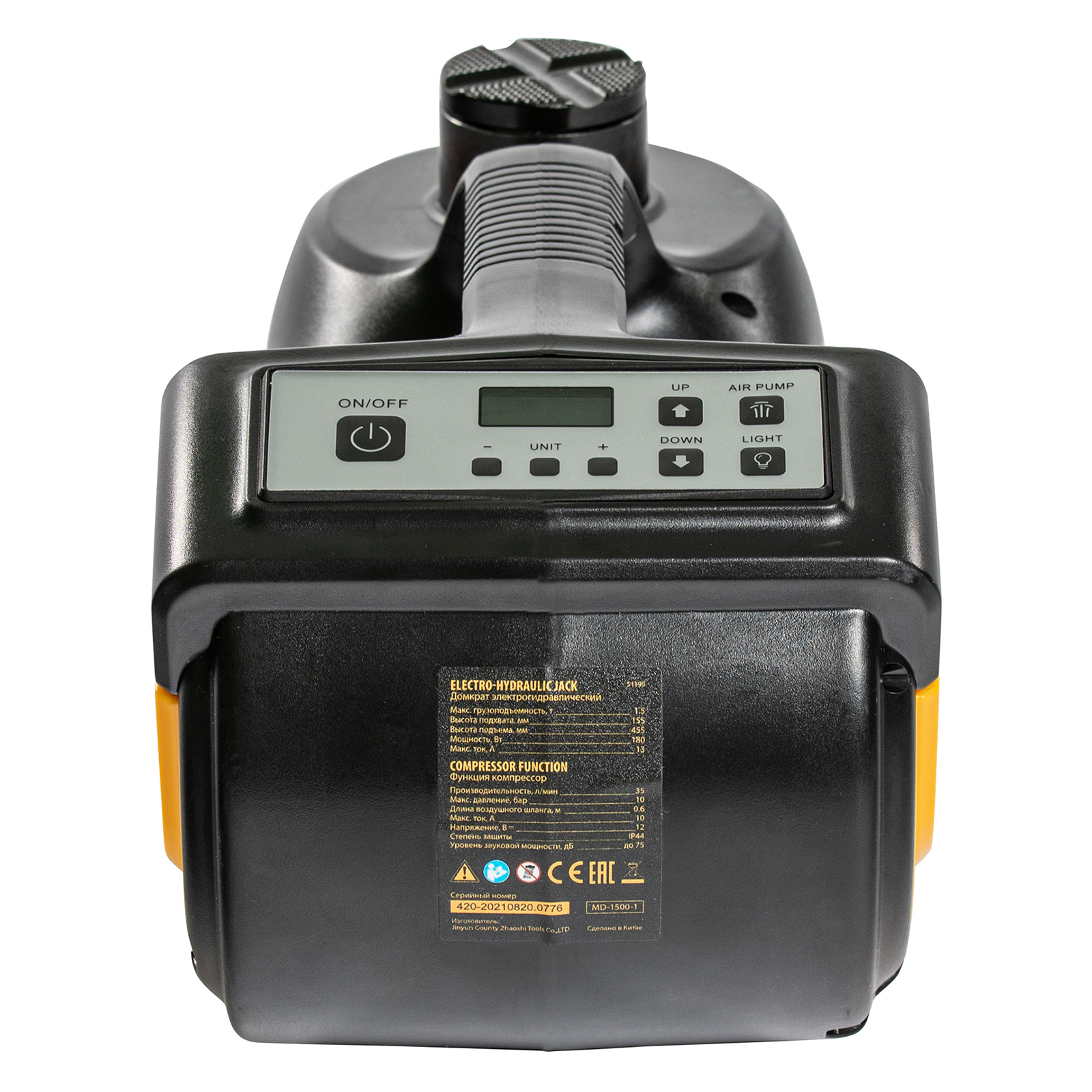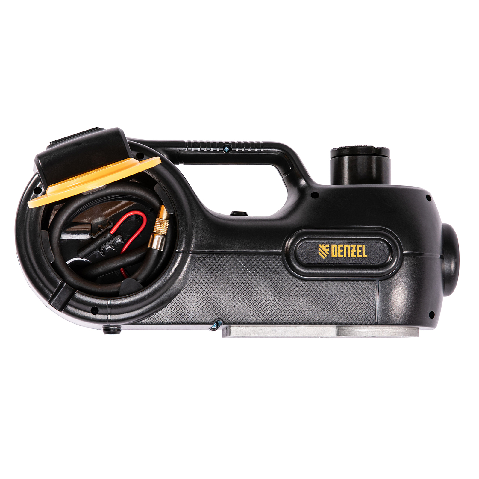 - Продуманная конструкция — в корпусе домкрата имеются отсеки для хранения аксессуаров, а также шланга и кабеля питания.