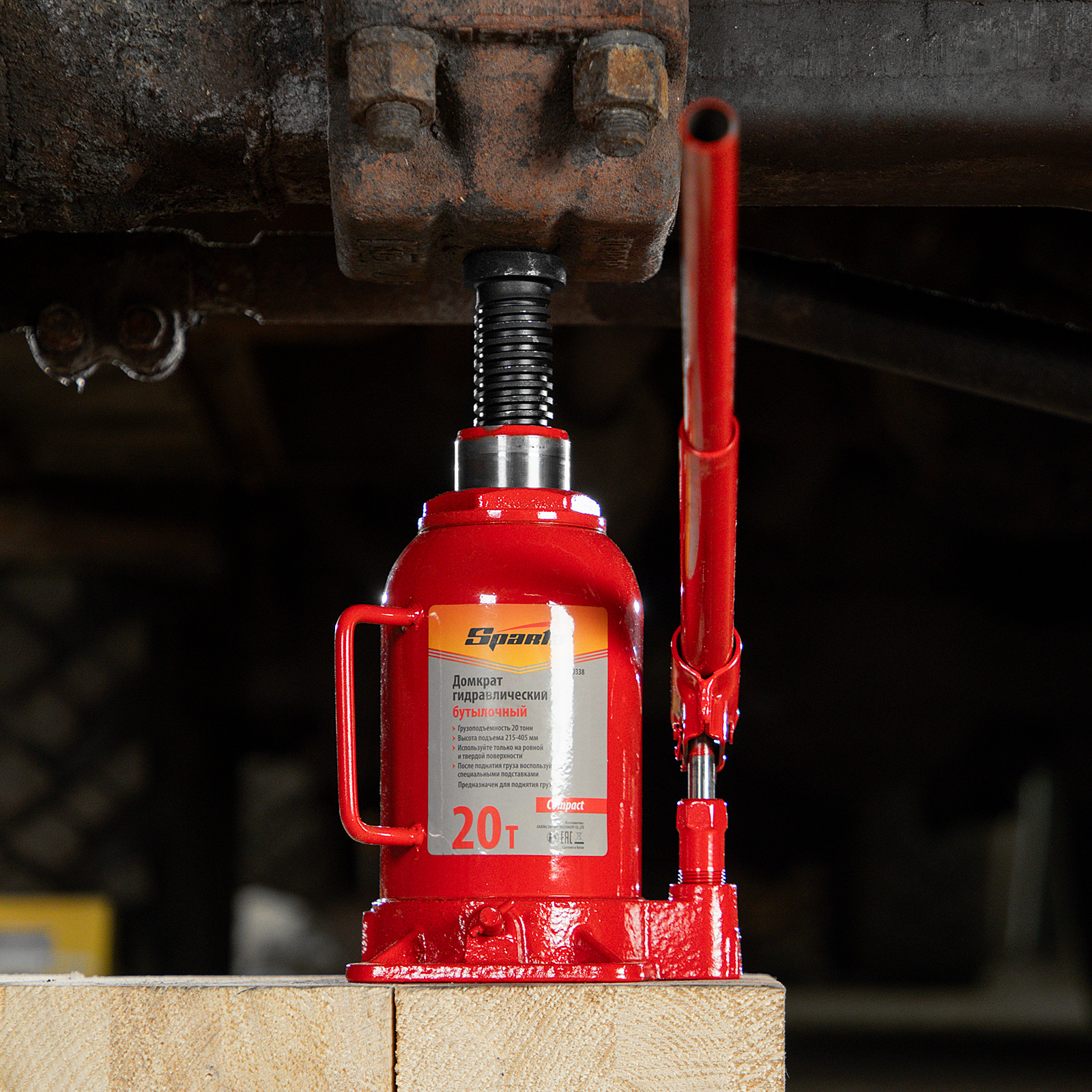 Гидравлический бутылочный домкрат Sparta Compact 50338 предназначен для подъема грузов весом до 20 т на высоту 215-405 мм. Существенно облегчает рабочий процесс, т.к. не требует больших усилий от пользователя. Домкрат будет полезен в автосервисе и гараже для проведения технического обслуживания авто.