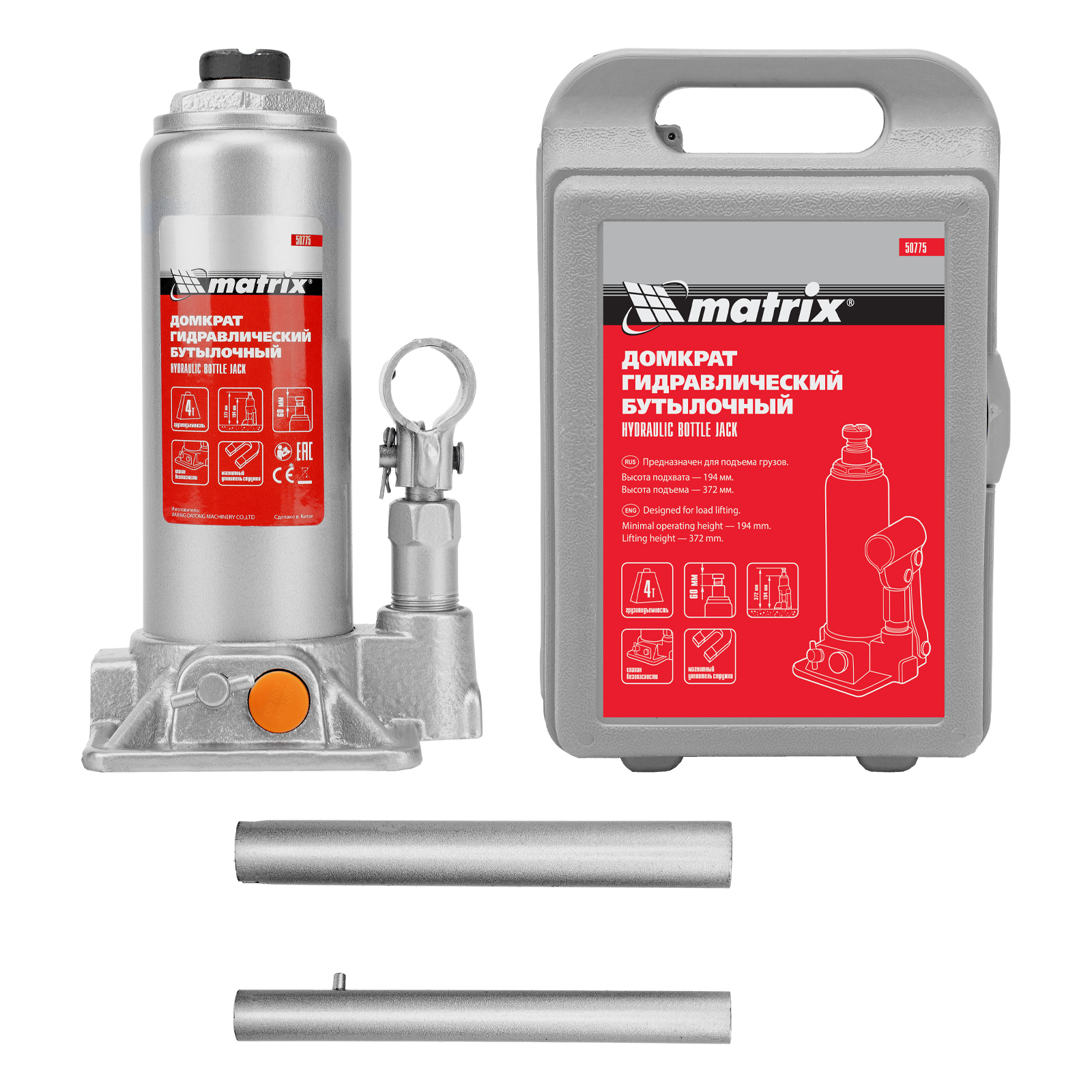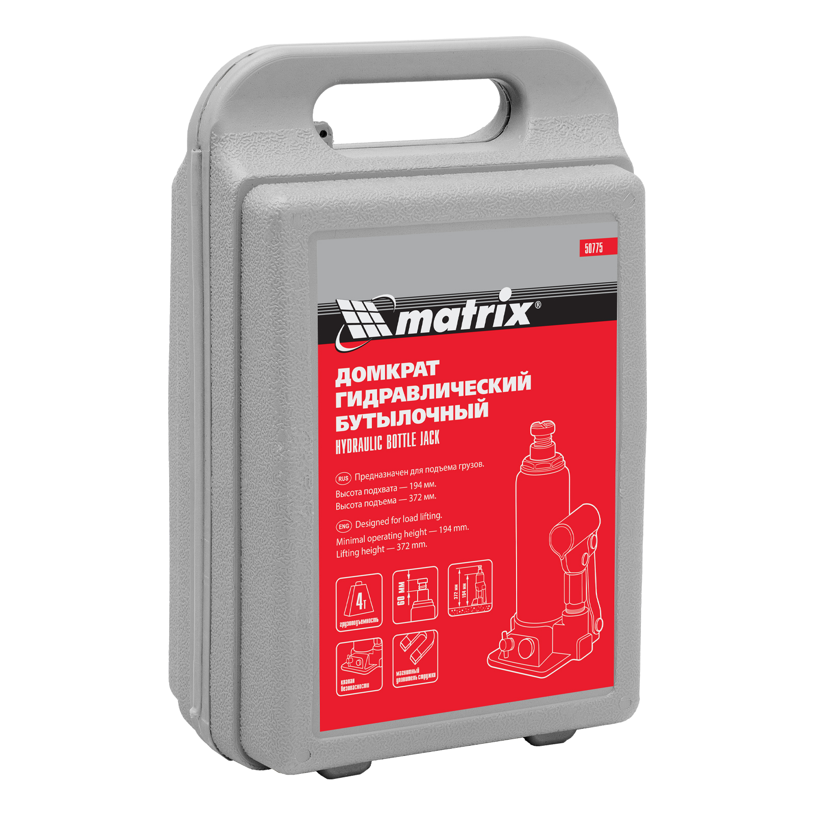 Домкрат гидравлический бутылочный, 4 т, h подъема 194-372 мм, в пластиковом кейсе Matrix в Екатеринбурге