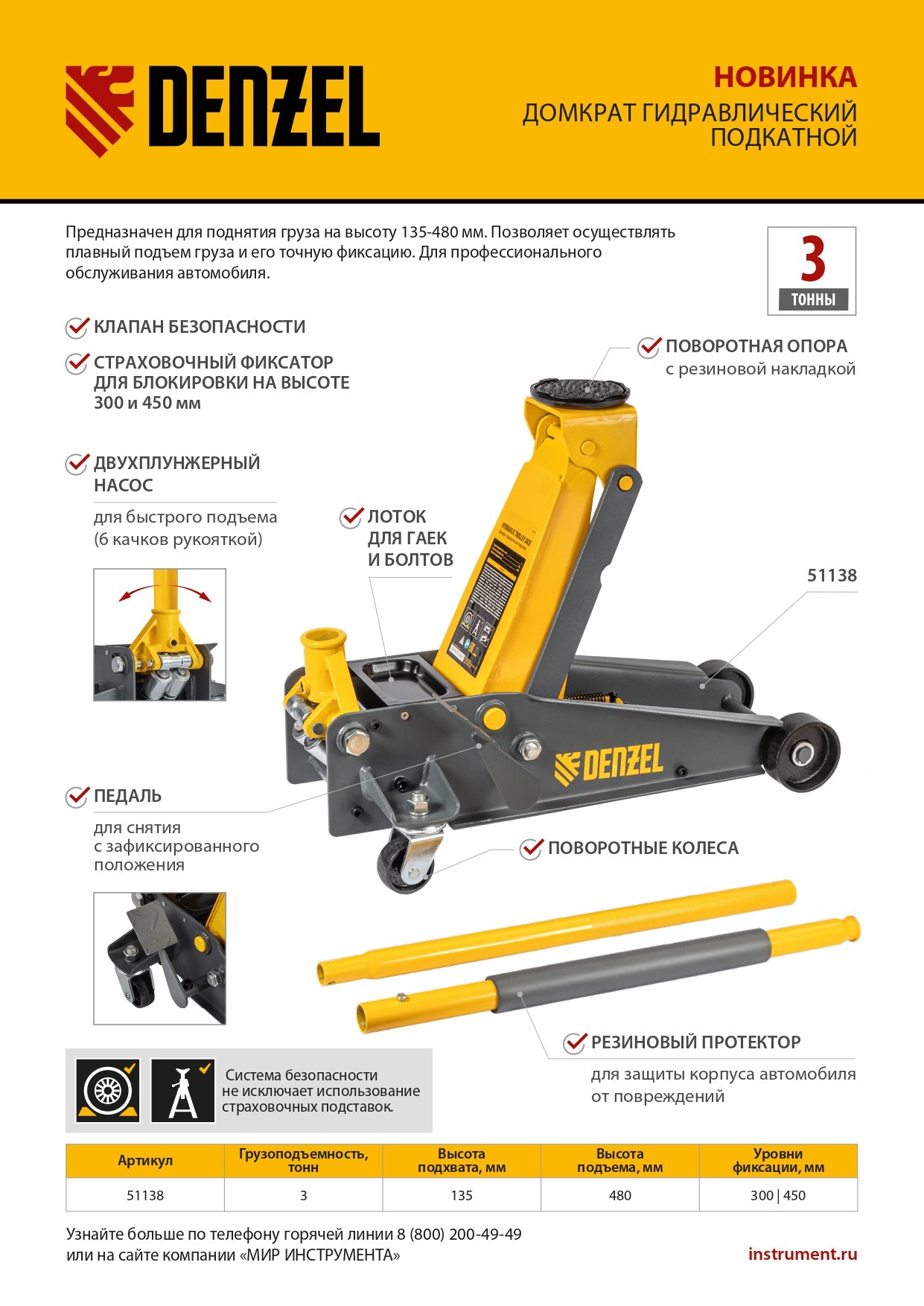 Профессиональный подкатной гидравлический домкрат Denzel 51138 с фиксатором позволяет быстро и плавно поднимать грузы массой до 3 т на высоту 135-480 мм. Подходит всех типов автомобилей со стандартным клиренсом. Предназначен для использования на станциях техобслуживания и шиномонтажа.
