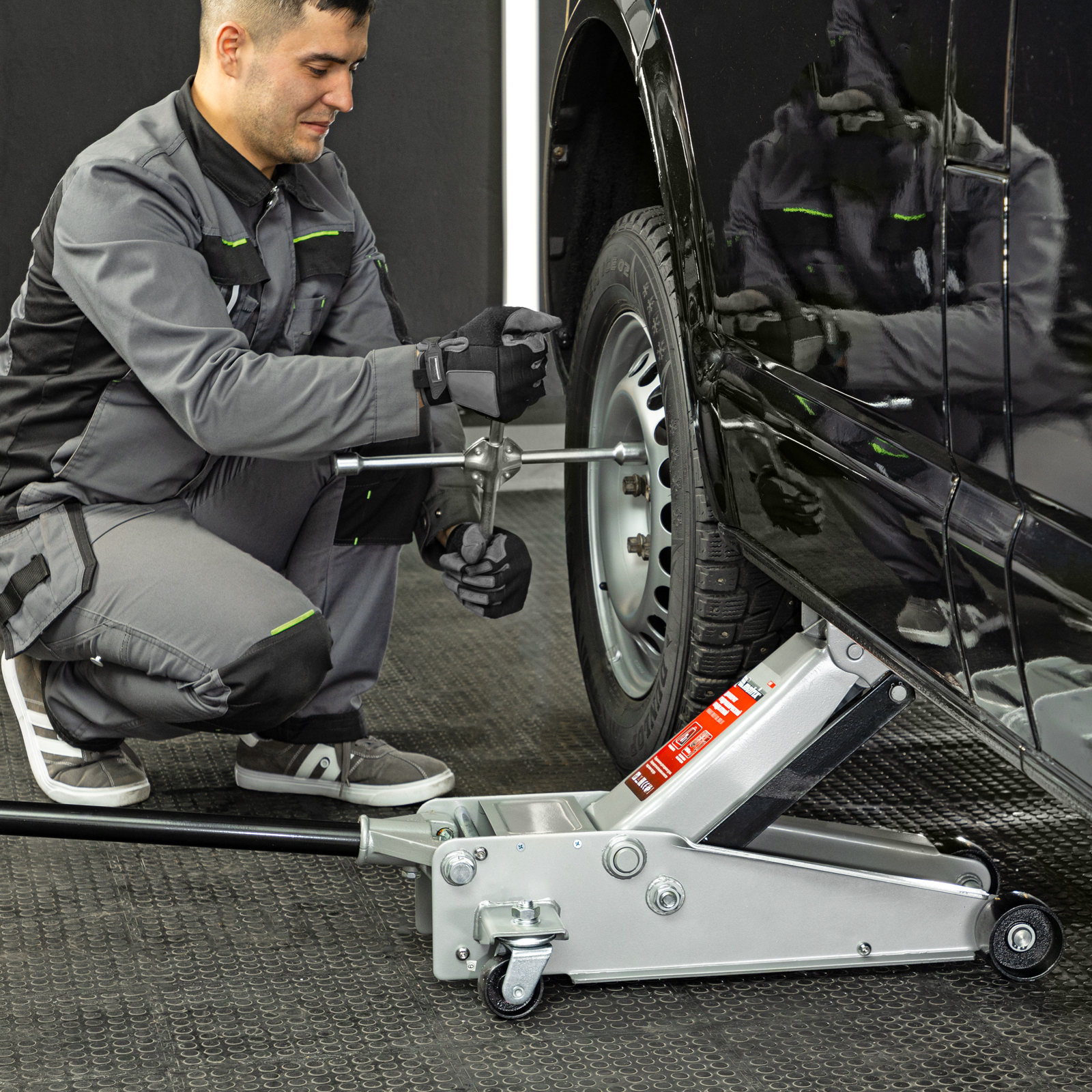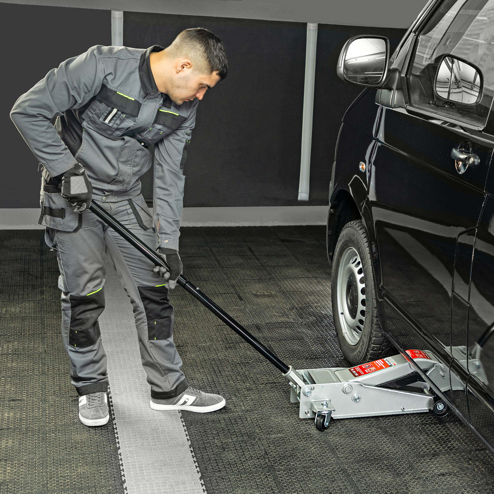 Подкатной гидравлический домкрат Matrix Quick Lift 51047 с системой быстрого подъема на высоту 130-465 мм — профессиональное гаражное оборудование, способное поднимать груз массой до 3 т. Высота подхвата 130 мм позволяет использовать домкрат для автомашин со стандартным клиренсом. Домкрат будет полезен в шиномонтажных центрах и автосервисах.