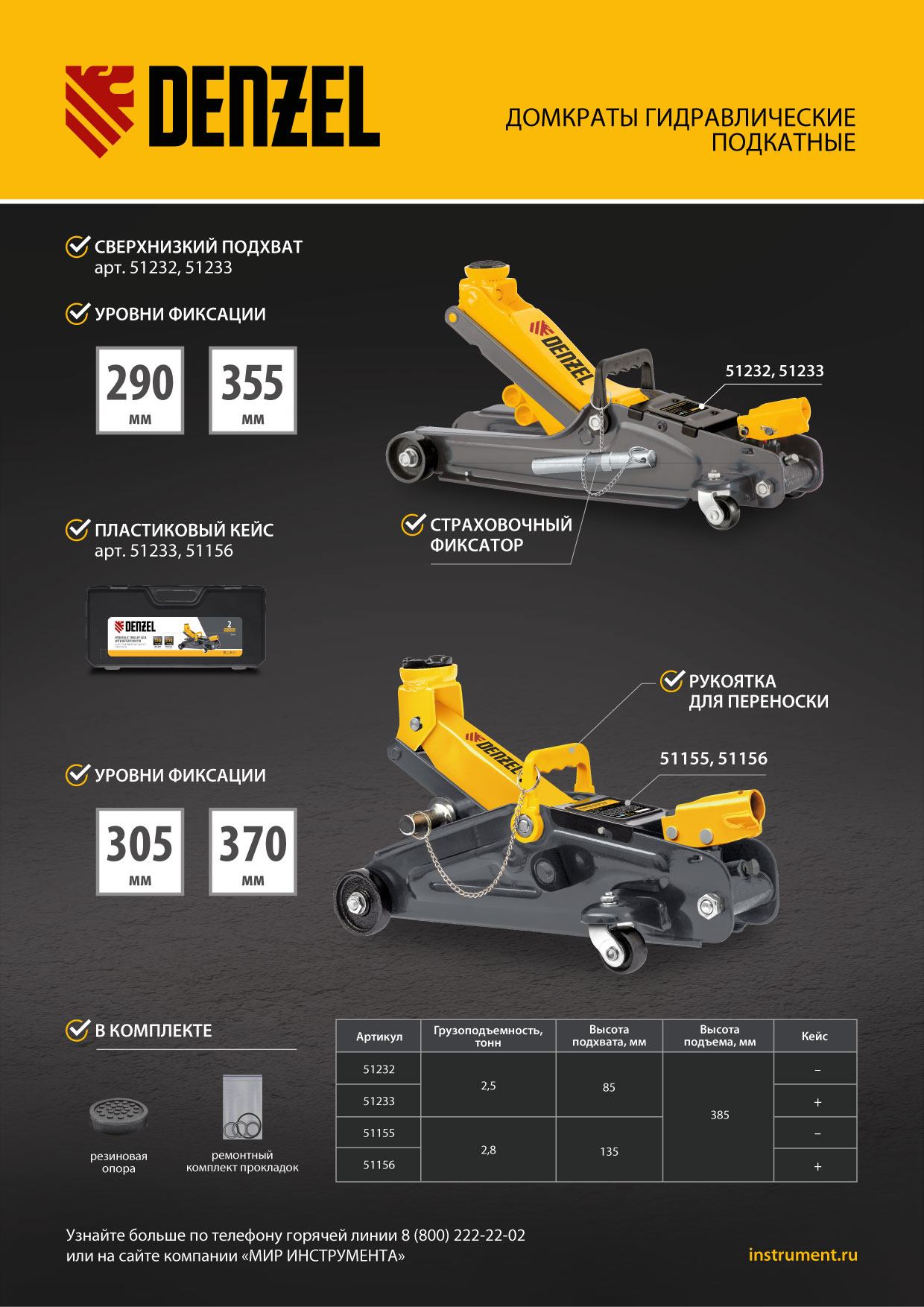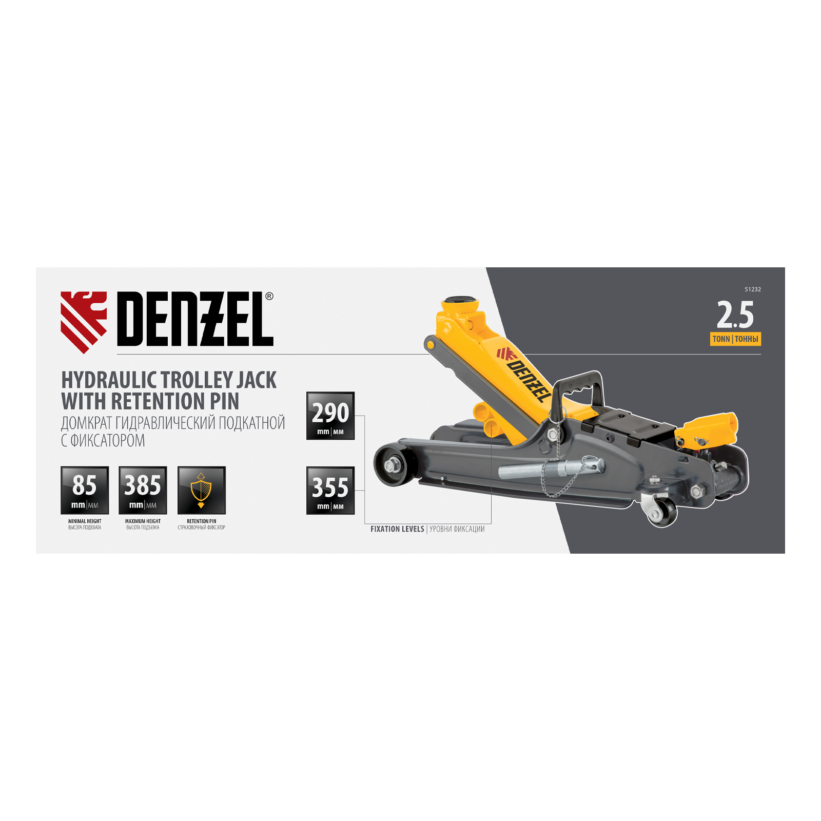 Гидравлический подкатной домкрат Denzel 51232 с фиксатором имеет высоту подхвата 85 мм и предназначен для плавного подъема грузов массой до 2,5 т на высоту до 385 мм. Страховочный штифт позволяет фиксировать подъемный рычаг на высоте 290 и 355 мм для безопасной работы. Домкрат пригодится владельцам легковых автомобилей с низким и стандартным клиренсом.
