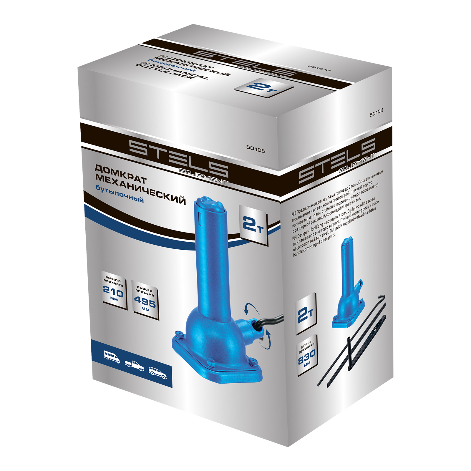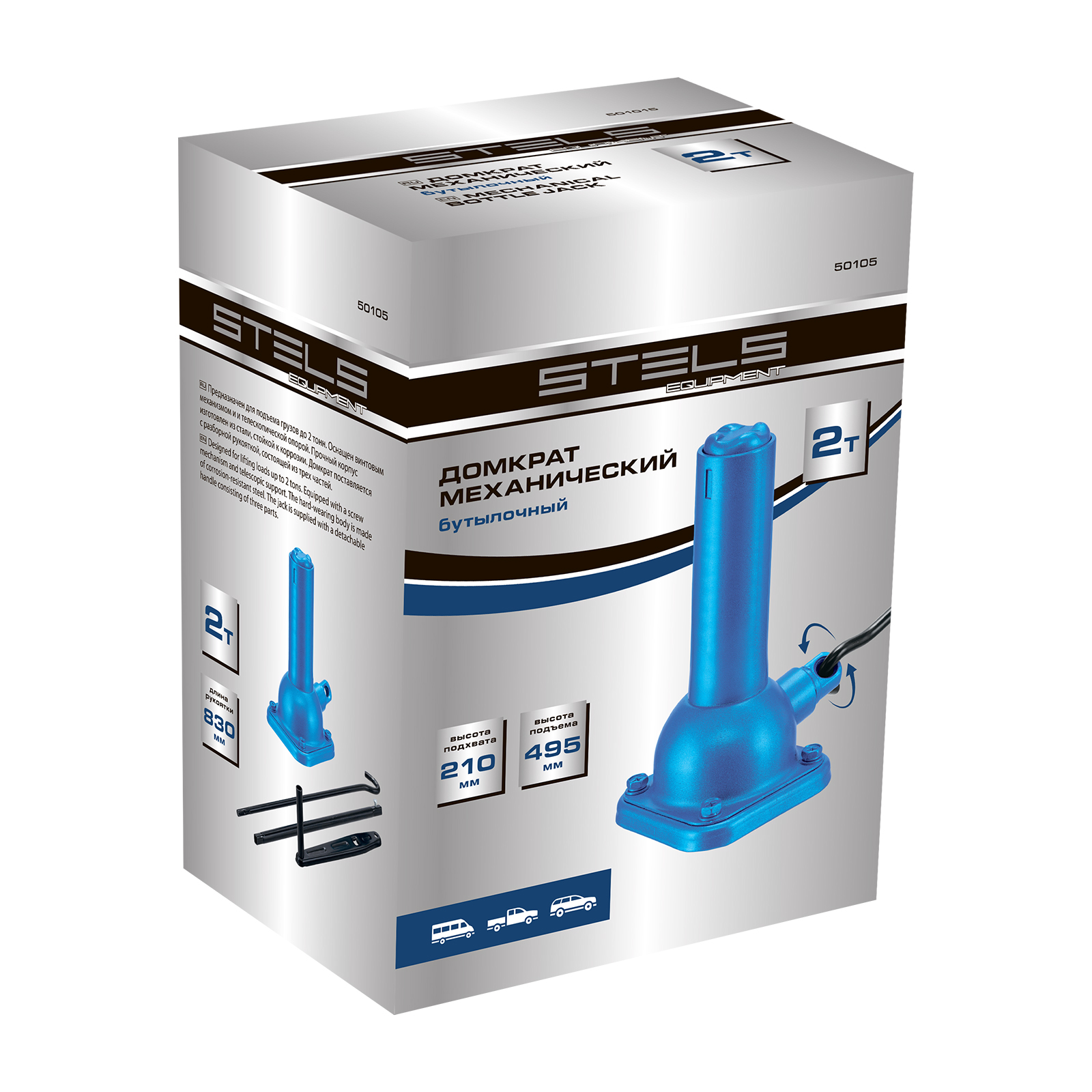 Механический бутылочный домкрат Stels 50105 состоит из 2 частей: самого домкрата и ручки, имеет телескопический шток и используется для быстрого подъема грузов массой до 2 т на высоту от 210 до 495 мм. Домкрат предназначен для самостоятельного применения, будет полезен владельцам легковых автомобилей в дороге и гараже.