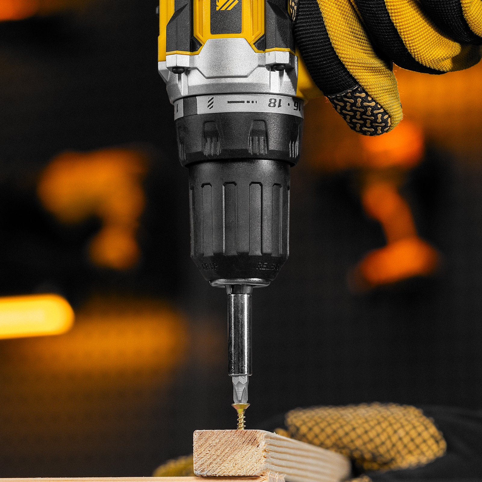 - Настройка крутящего момента — 18+1 ступень регулировки позволяет выбрать оптимальный режим в зависимости от типа крепежа и плотности материала.
