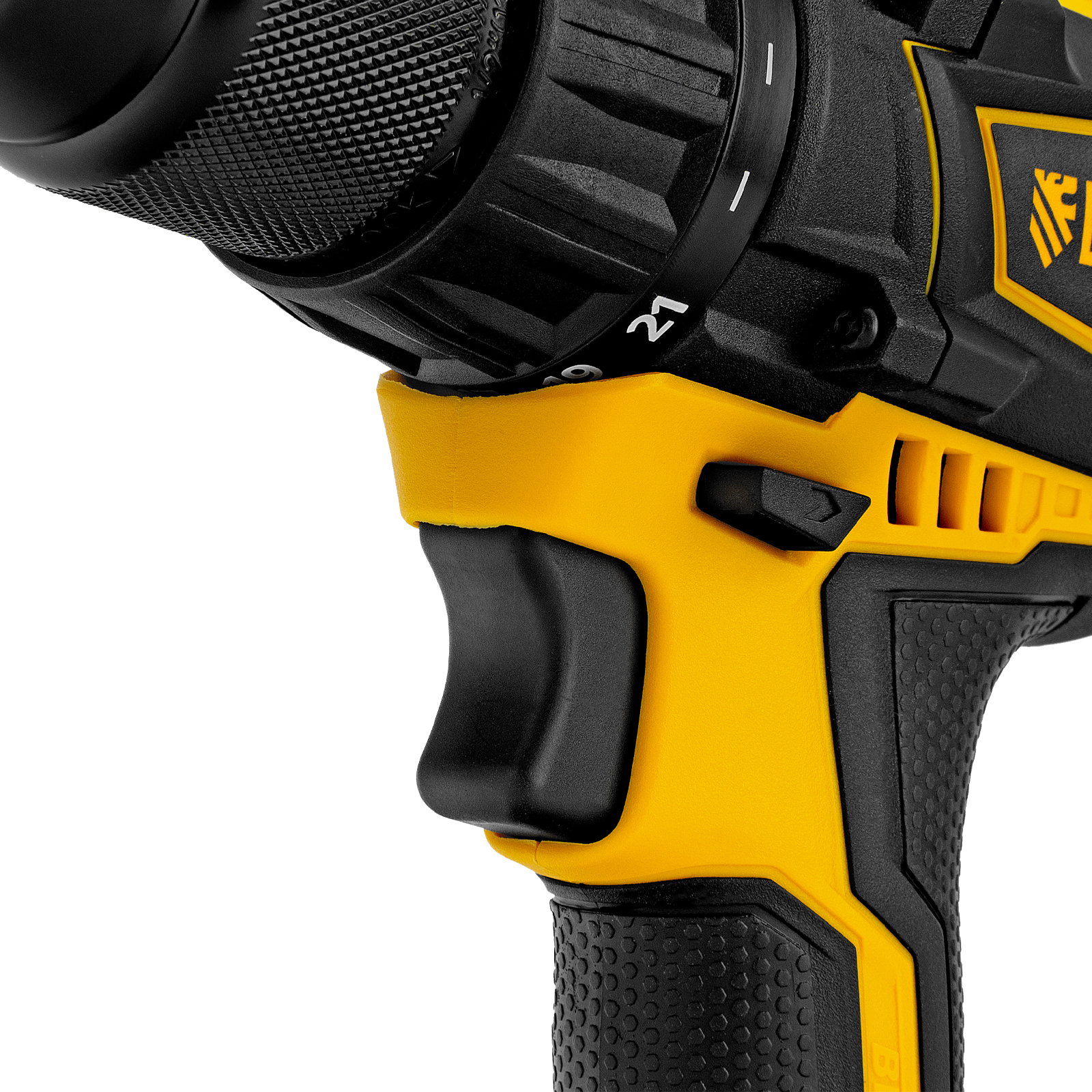 - Универсальность — дрель-шуруповерт совместима с любым Li-Ion аккумулятором и зарядным устройством единой платформы Denzel Battery System 18V.