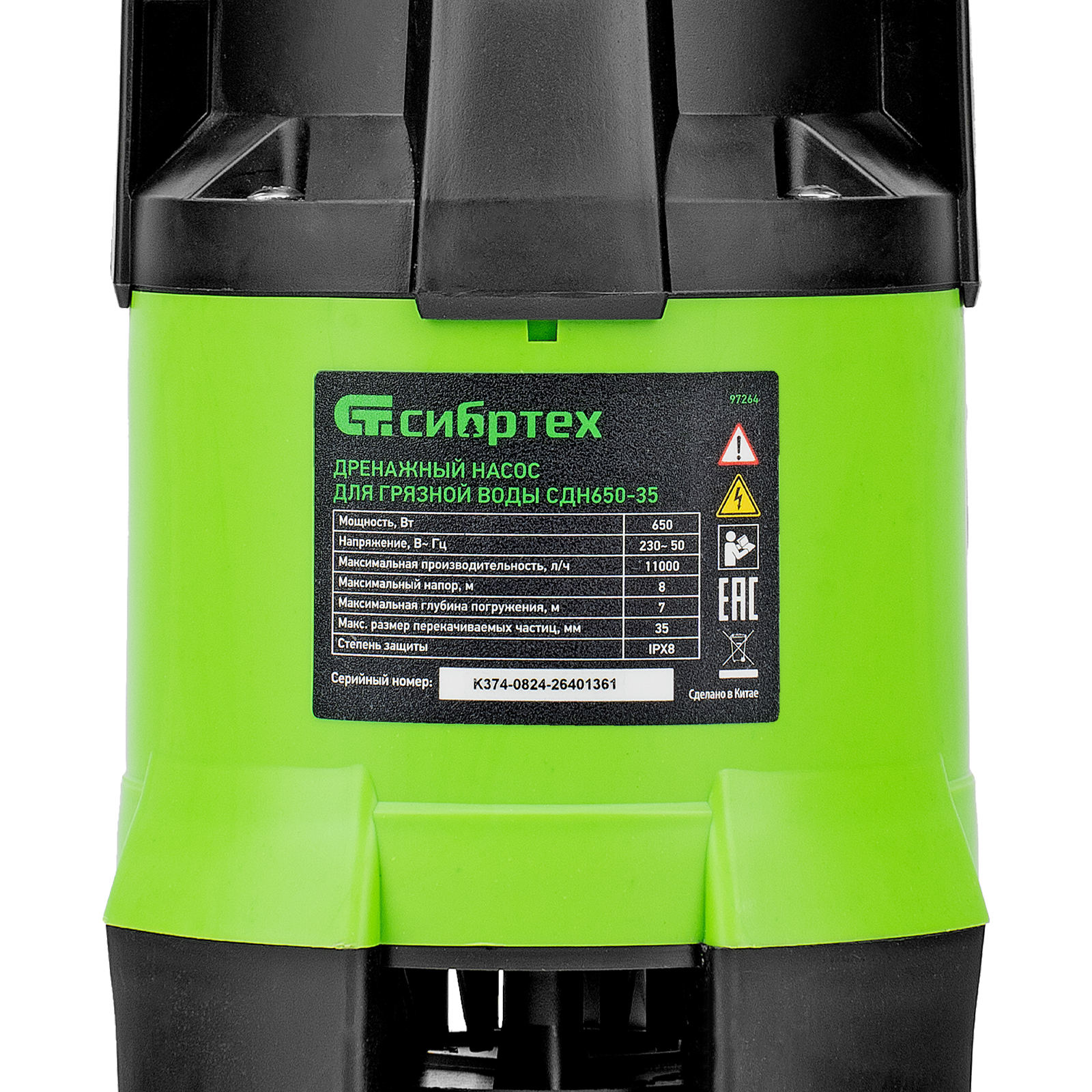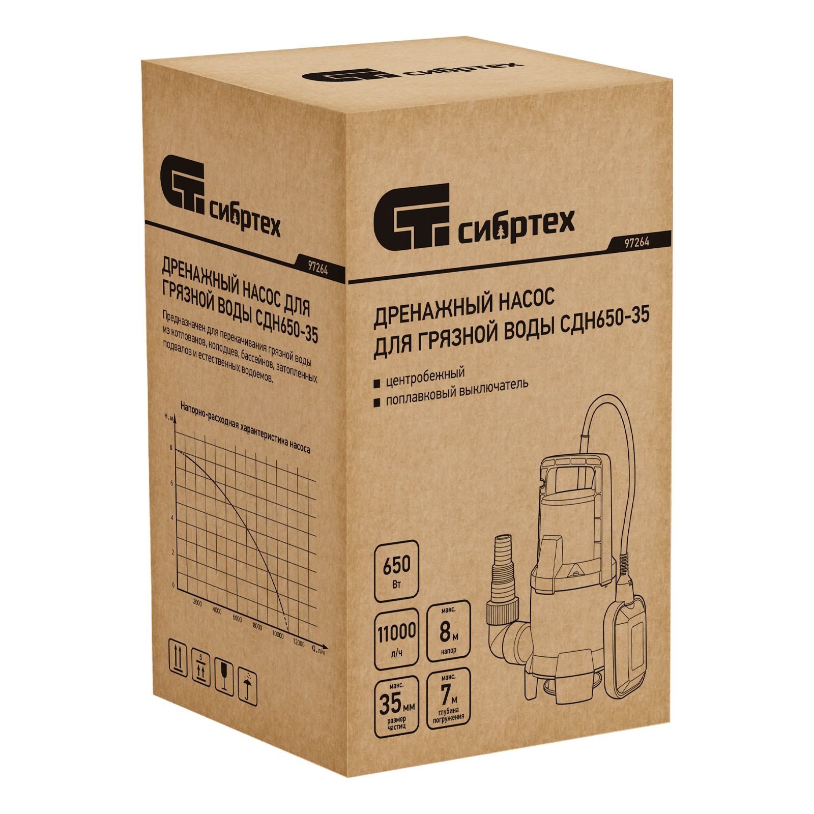 Дренажный насос Сибртех СДН650-35 97264 мощностью 650 Вт и производительностью 11000 л/ч обеспечивает напор до 8 м и предназначен для перекачивания жидких бытовых отходов и сточных вод, содержащей плавающие твердые включения размером до 35 мм. Насос питается от однофазной сети с напряжением 230 В, поэтому подходит для применения в частных домах, дачных коттеджах и на небольших строительных объектах