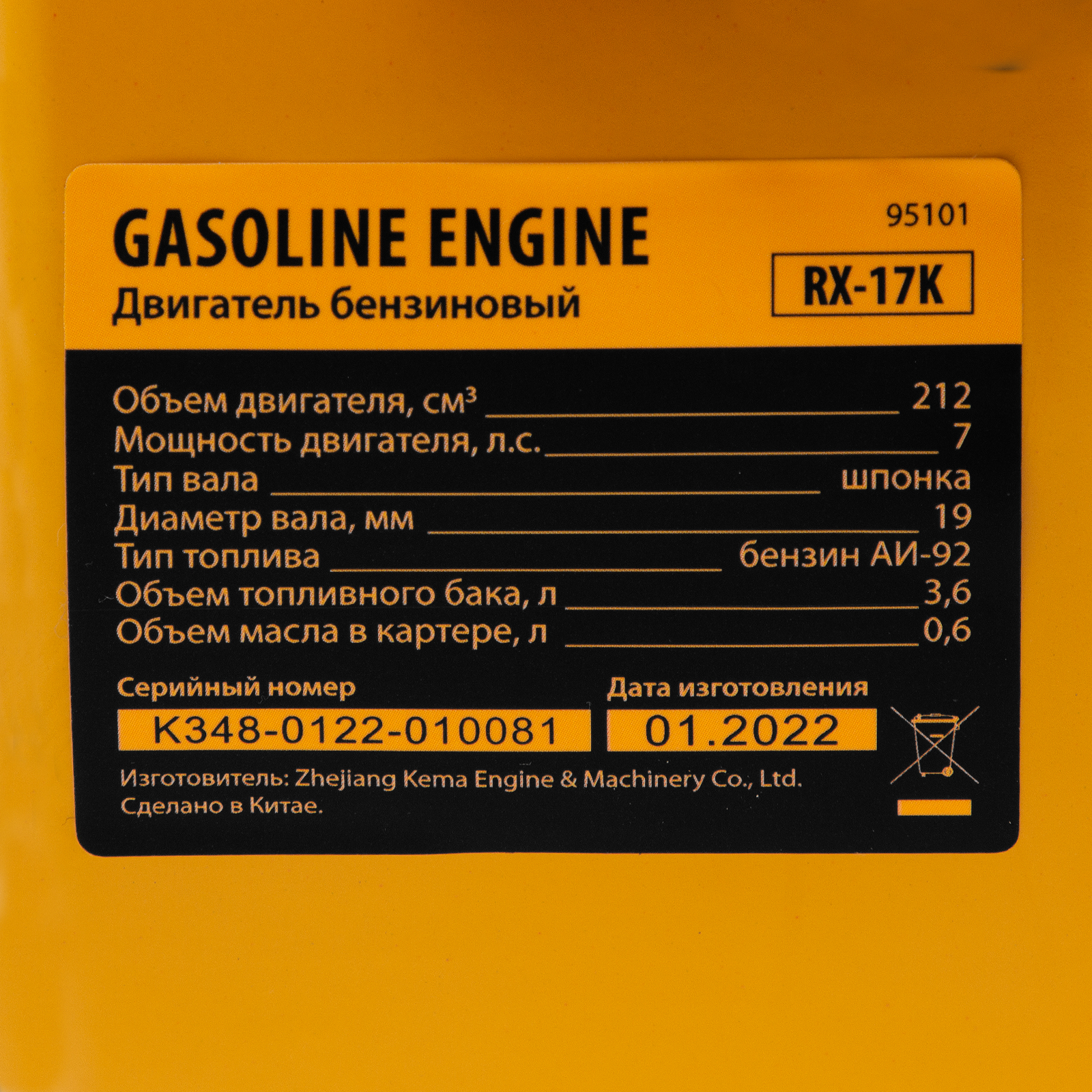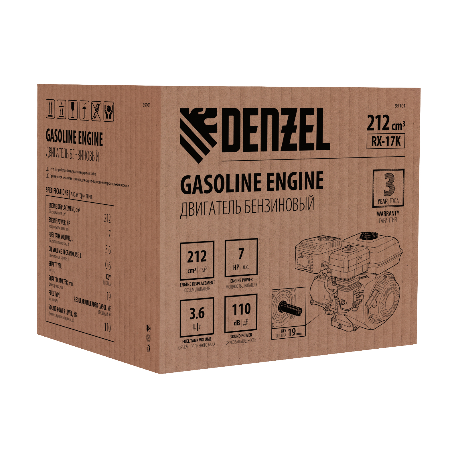 Четырехтактный бензиновый двигатель Denzel RX-17K 95101 мощностью 7 л. с. и объемом 212 см3, с типом горизонтального вала шпонка 19 мм, имеет ручной старт и воздушное охлаждение. Предназначен для использования в качестве привода садово-парковой и строительной техники (садовых измельчителей, мотопомп, бензиновых моек высокого давления и др.). Обеспечивает бесперебойное функционирование оборудования и эффективное выполнение сельскохозяйственных, строительных работ, а также решение прочих задач на загородном участке.