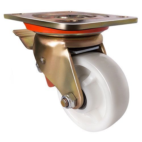 Данное большегрузное нейлоновое колесо предназначено для установки на передвижное оборудование, используемое в пищевой, химической и фармацевтической промышленности. Оно не боится воздействия влаги и различных химически агрессивных веществ, отличается низким коэффициентом трения и высокой износостойкостью. Шариковый подшипник в оси обеспечивает плавное вращение. Поворотный кронштейн изготовлен из оцинкованной стали, тип крепления — платформа с отверстиями под болты. Наличие тормозного механизма позволяет при необходимости надежно блокировать колесо, предотвращая его самопроизвольное перемещение. Максимальная грузоподъемность модели — 550 кг.