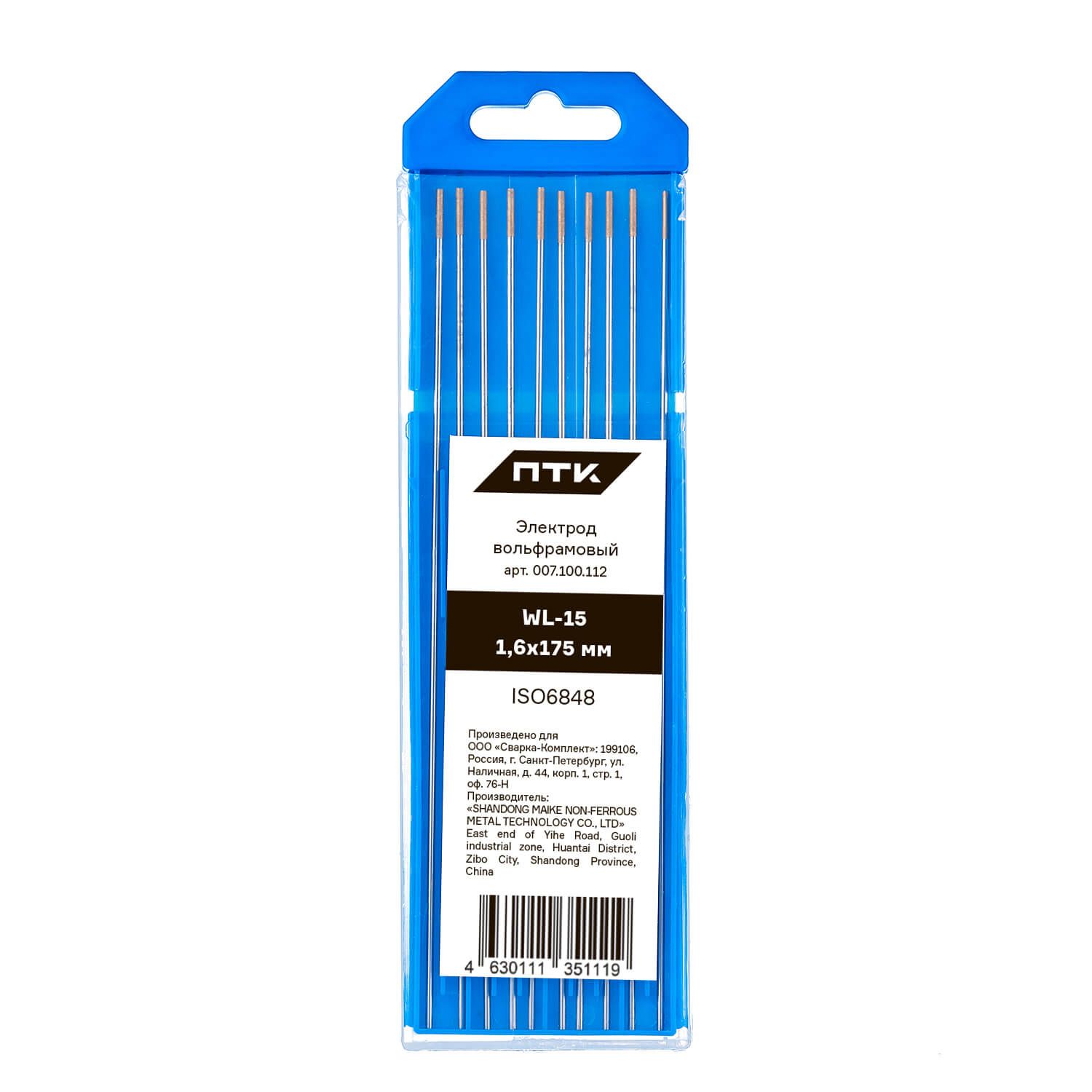 Диаметр электрода 1,6 мм, длина электрода 175 мм. Вольфрам имеет отличительное цветовое обозначение – золотой торец.