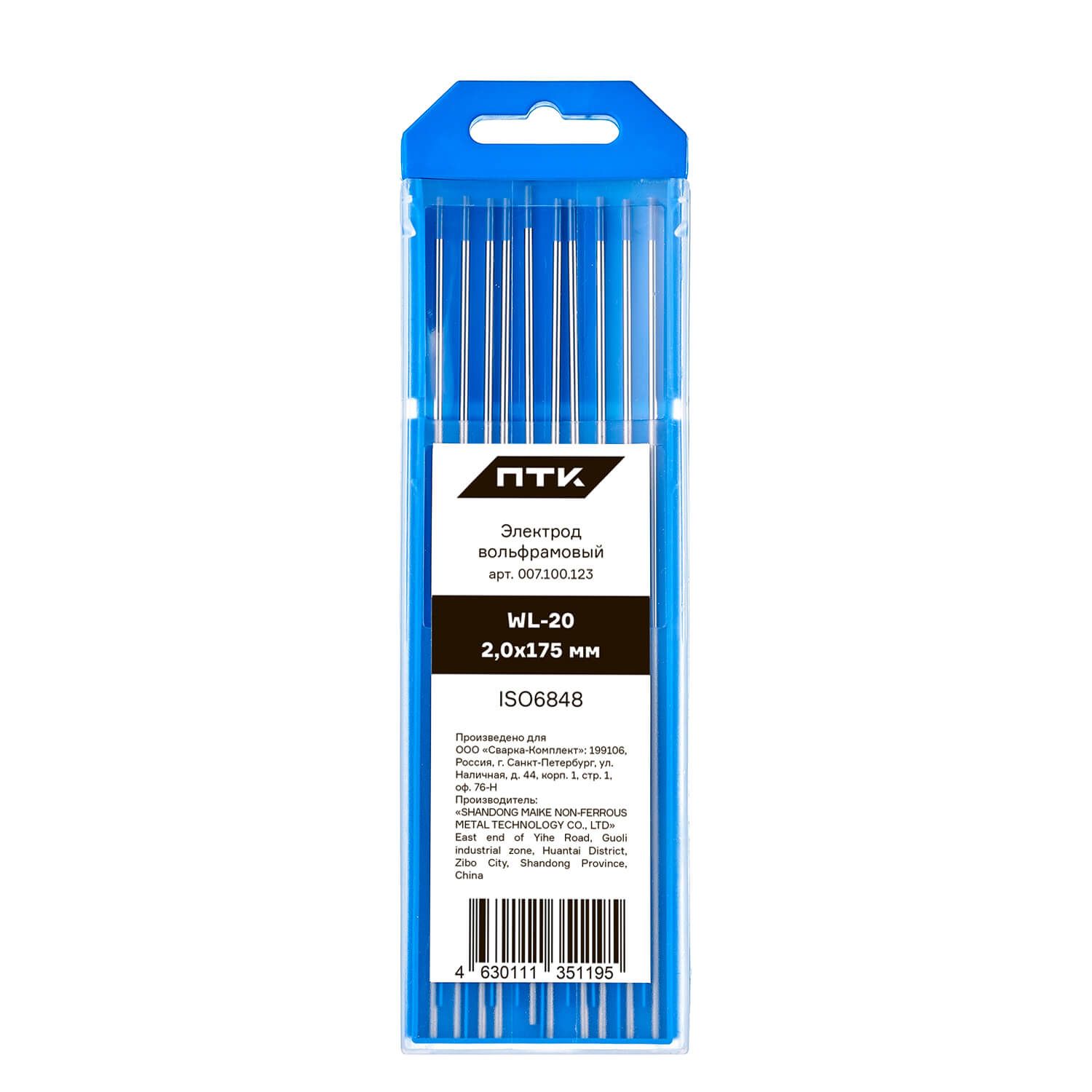 Диаметр электрода 2,0 мм, длина электрода 175 мм. Вольфрам имеет синий цветовой код. Поставляется в пластиковом пенале по 10 штук. В карточке с товаром указана цена за 1 вольфрамовый электрод.