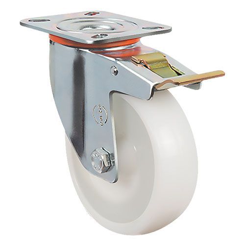 Колесная опора EMES EM01 ZKZ 100 F устанавливается на платформенные тележки для пищевой промышленности, передвижное медицинское оборудование и технику. Нейлоновый обод хорошо распределяет нагрузку. Поворотный кронштейн с тормозом изготовлен из оцинкованной стали. Максимальная грузоподъемность модели составляет 140 кг. Рабочий температурный диапазон — от -20 до +70 °С.