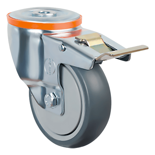 Аппаратное колесо EM04 MBT 125 F предназначено для установки на торговое оборудование, больничную мебель, медицинскую аппаратуру и т. п. Шинка выполнена из серой резины, кронштейн — из оцинкованной стали, а обод — из полипропилена. Колесо имеет диаметр 125 мм, ширину обода 32 мм и работает в температурном диапазоне от -20 до +60 °С. Грузоподъемность модели — 90 кг.