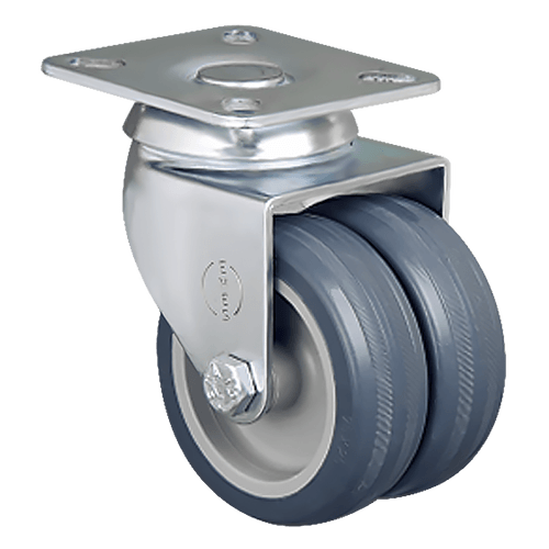 Данная сдвоенная аппаратная колесная опора предназначена для установки на торговое оборудование, больничную мебель, медицинскую аппаратуру и т. п. Контактный слой выполнен из серой резины, кронштейн — из оцинкованной стали. Модель имеет диаметр 50 мм, работает в температурном диапазоне от -20 до +60 °С. Грузоподъемность составляет 55 кг.