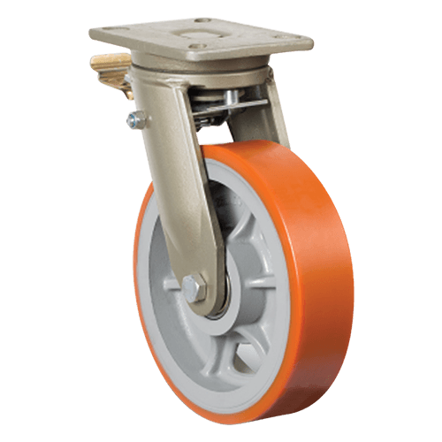 Поворотное большегрузное колесо EMES Большегрузное полиуретановое колесо EV 01 VBP 150F-50 диаметром 150 мм — оптимальный вариант для установки на большегрузное складское и строительное оборудование и платформенные тележки. Шинка изготовлена из полиуретана, обод — из высокопрочного чугуна, кронштейн — из оцинкованной стали, устойчивой от коррозии. Предусмотрено наличие тормоза-педали.