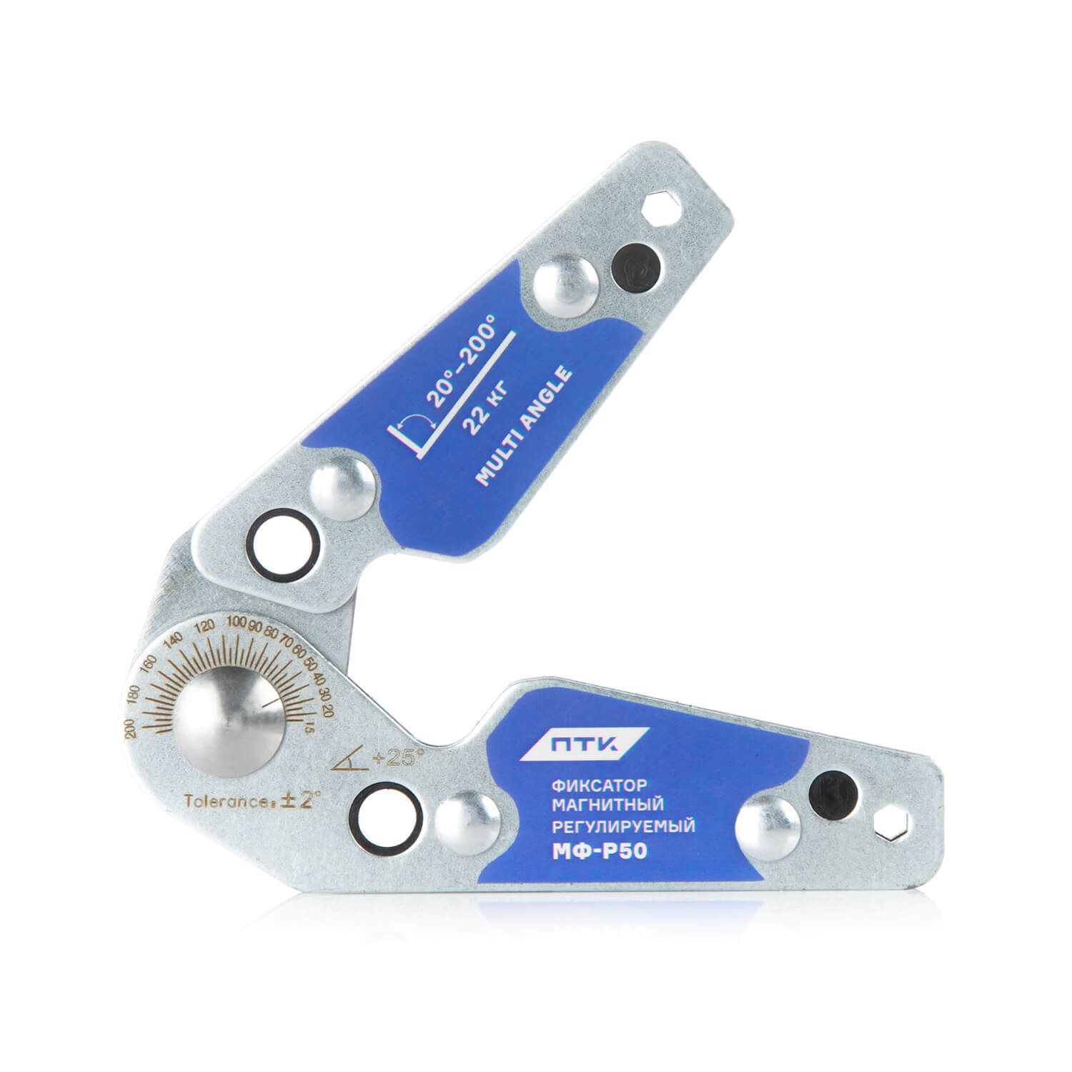 Магнит расположен внутри конструкции, что обеспечивает его чистоту от металлической стружки и других загрязнений. Максимальная масса удерживаемого изделия может достигать 22 кг. Магнитный фиксатор позволяет производить точное выставление углов в процессе сварки, пайки и монтаже конструкций с погрешностью 2°. МФ-Р50 позволяет регулировать угол от 20° до 200°.