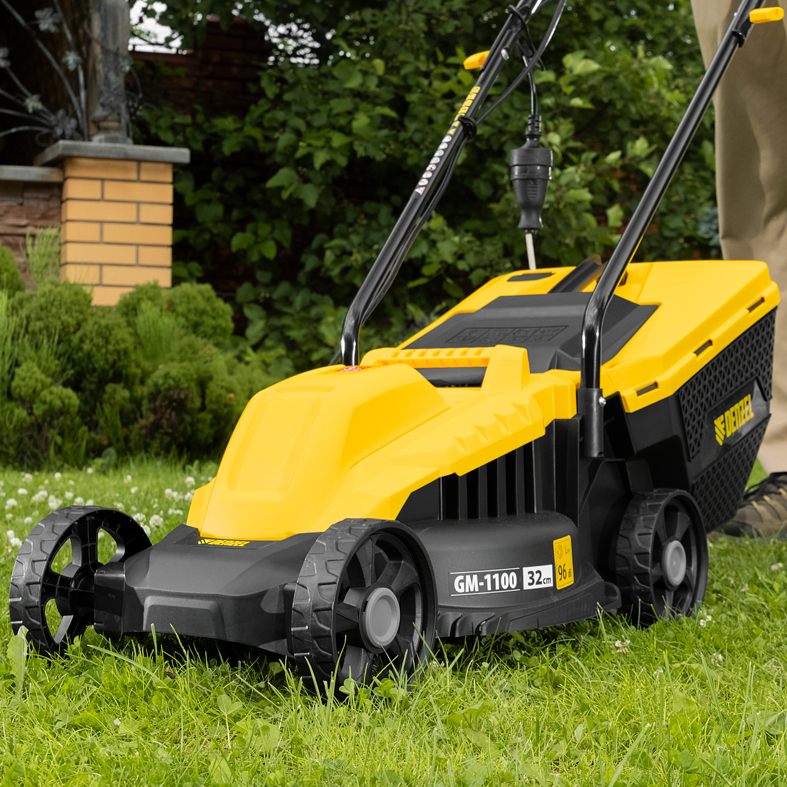 - Безопасность — функция блокировки исключает случайный запуск двигателя, а держатель кабеля предотвращает отключение техники от сети и уменьшает риск попадания провода под нож.
