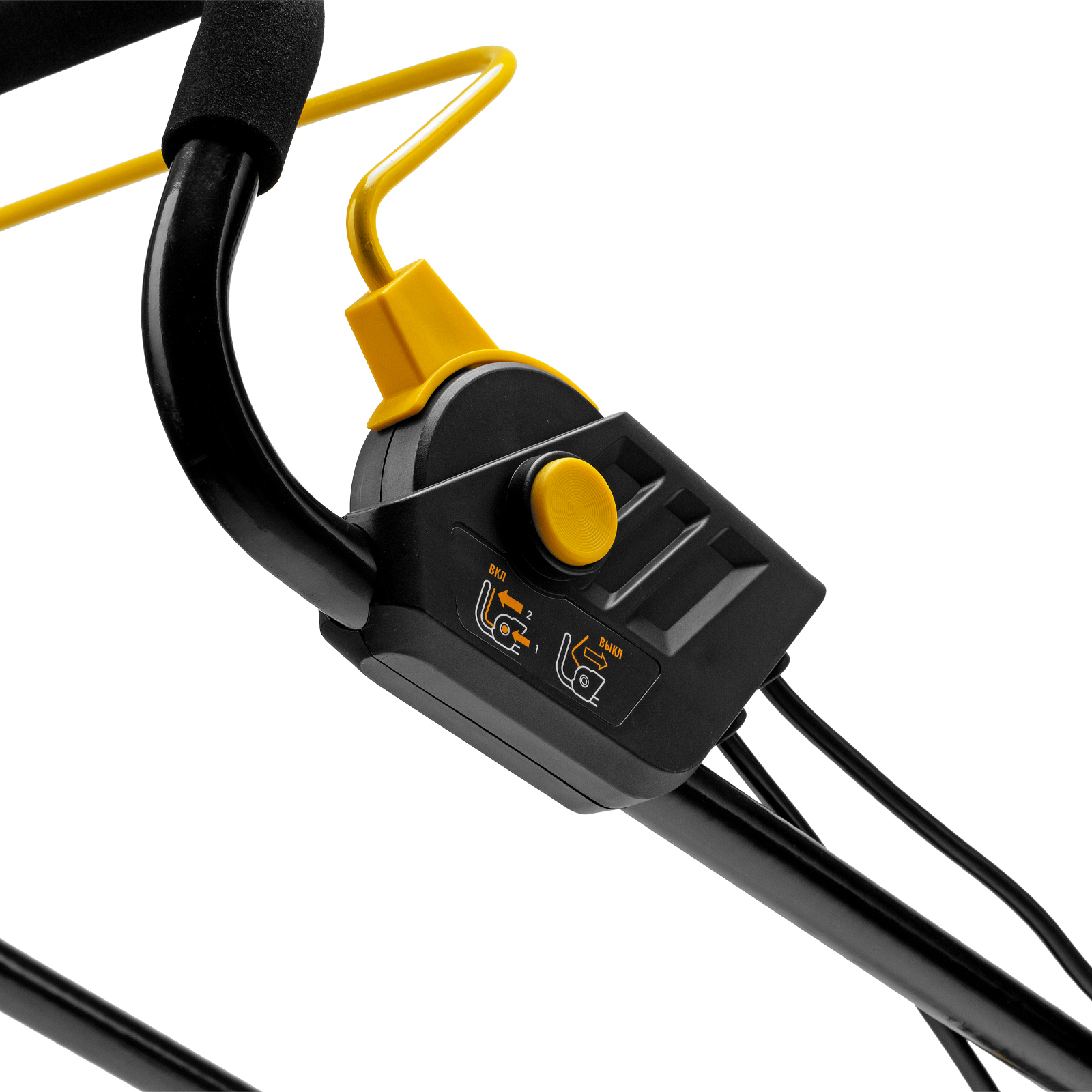 - Безопасность — функция блокировки исключает случайный запуск двигателя, а держатель кабеля предотвращает отключение техники от сети и уменьшает риск попадания провода под нож.
