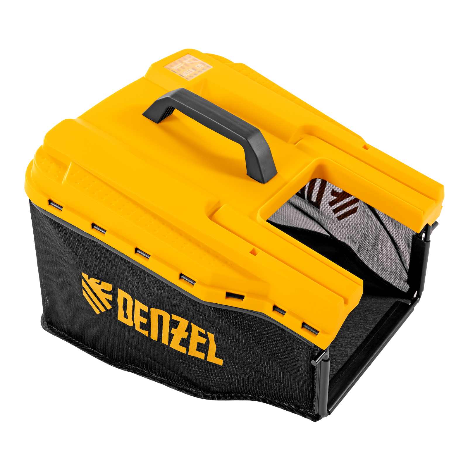 - Комбинированный травосборник — емкость на 45 л из прочного РР пластика и мягкого сетчатого материала легко очищать, а также удобно хранить в сложенном виде.