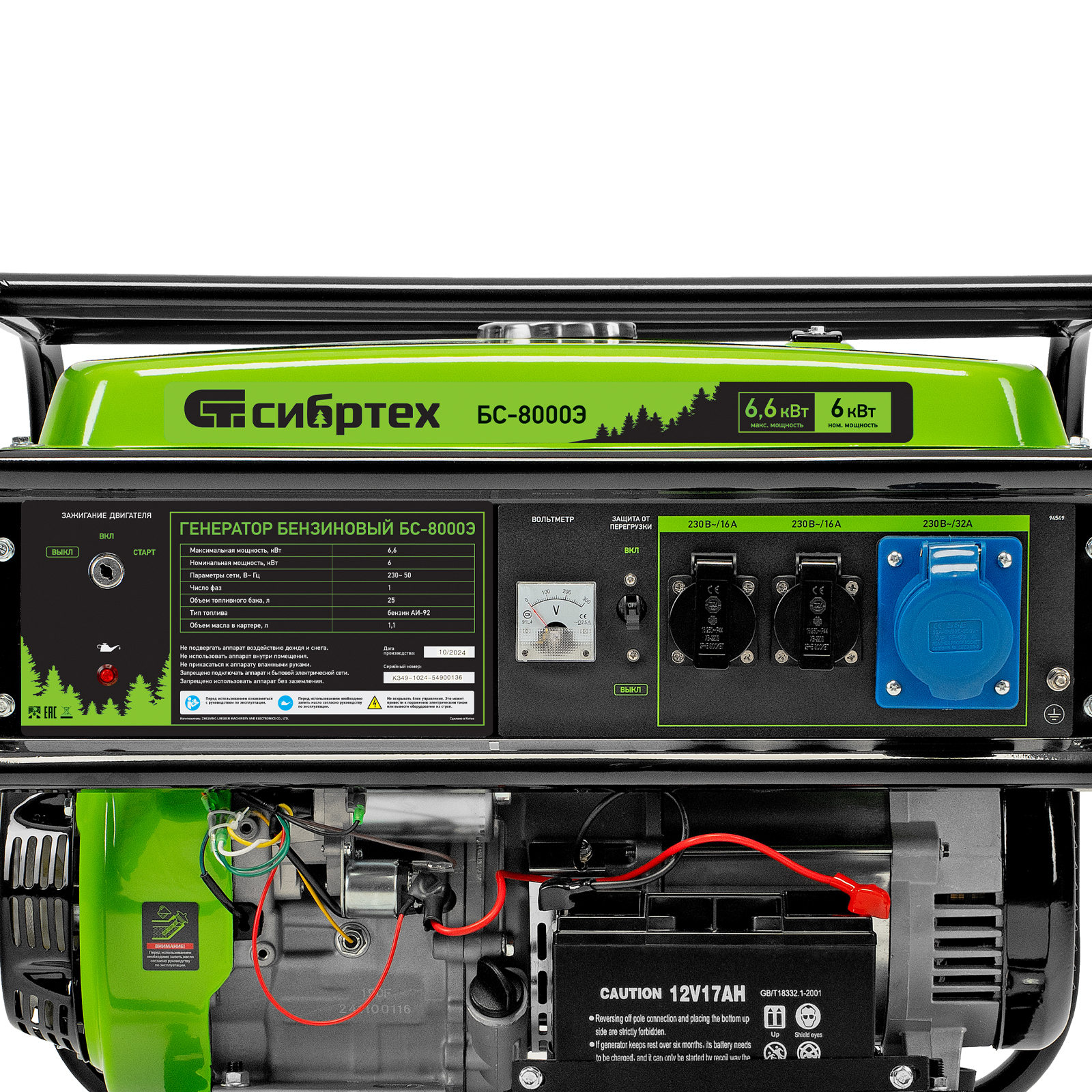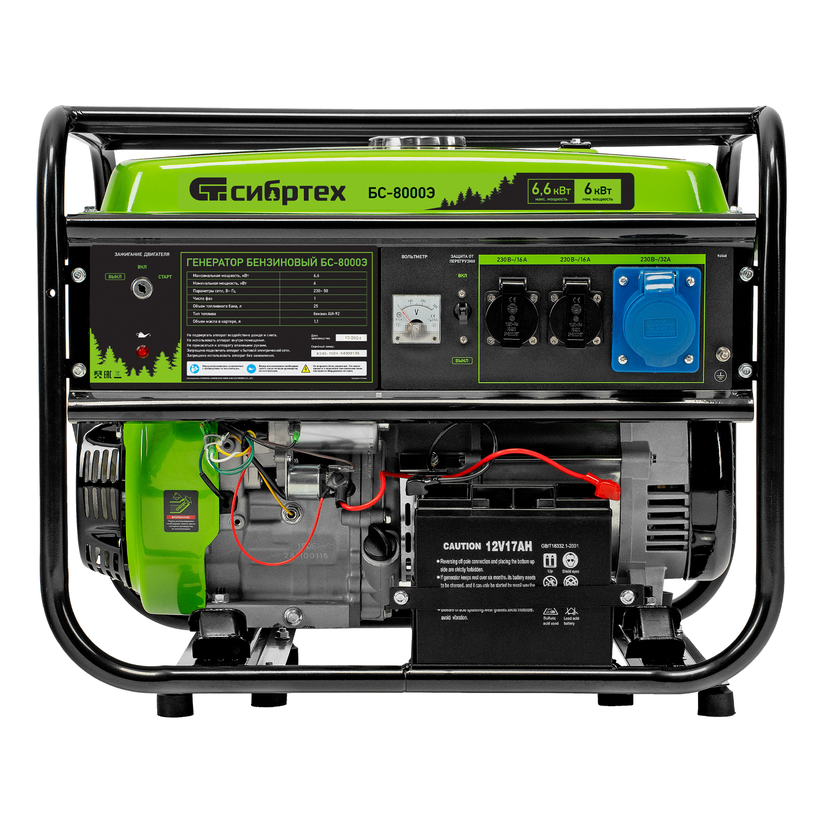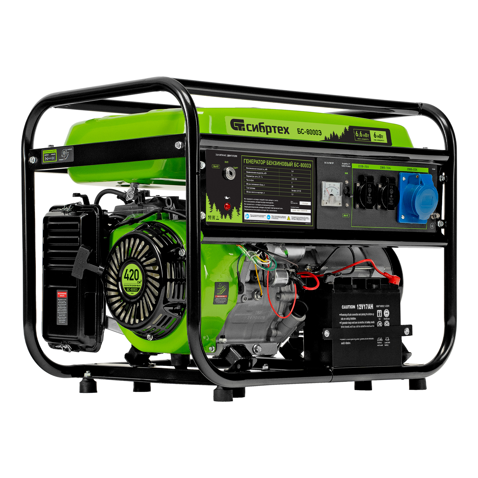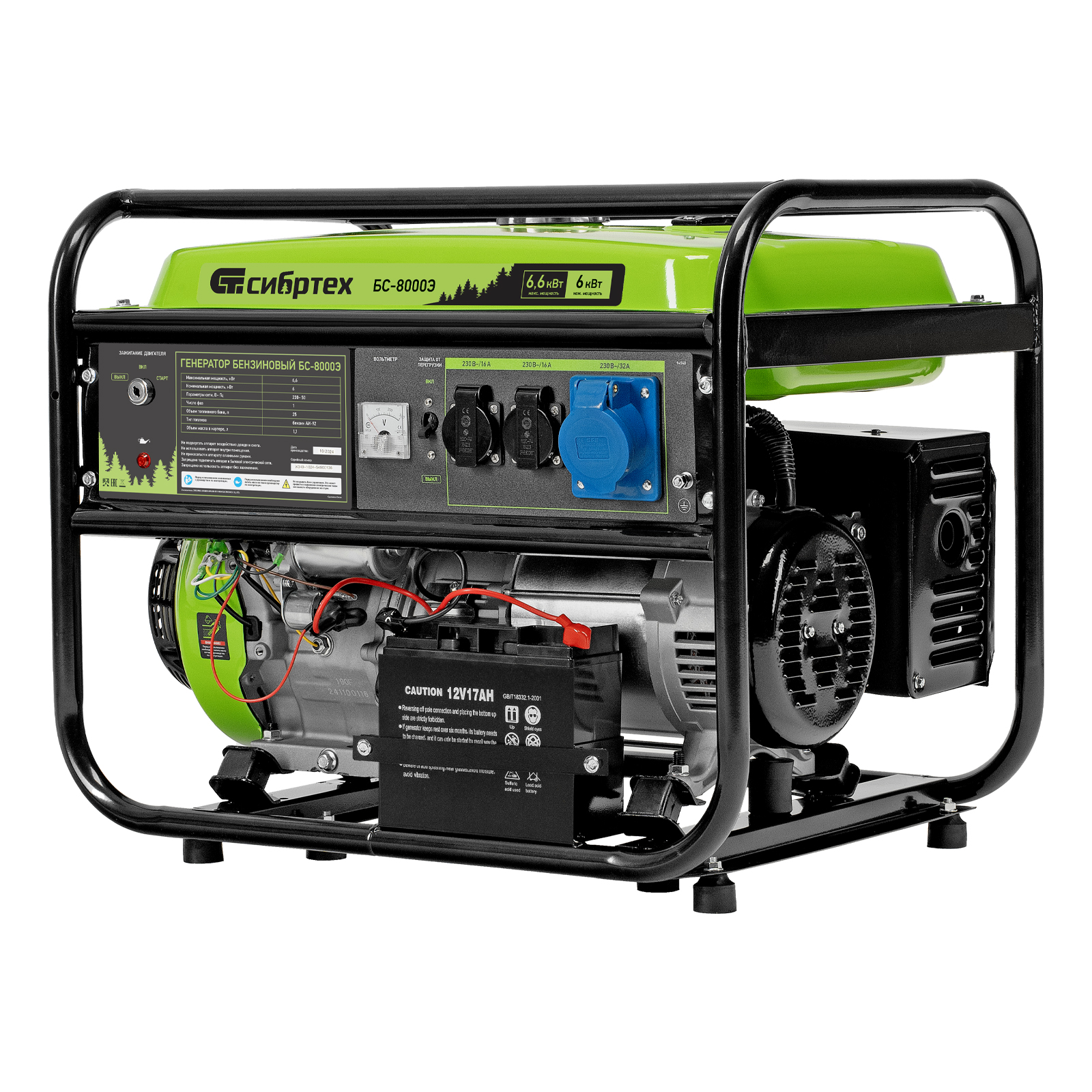 Бензиновый генератор Сибртех БС-8000Э 94549 мощностью 6,6 кВт, с 4-тактным двигателем, электростартером и баком объемом 25 л, выдает напряжение 230 В и является самым производительным в линейке. Подойдет для дачи, строительной площадки, мастерской, гаража или магазина. Благодаря мощности 6,6 кВт и наличию силовой розетки способен обеспечить бесперебойную работу нескольких потребителей одновременно, например, электрической плиты, холодильника, 5 ламп накаливания. Электростартер облегчает запуск — для начала работы достаточно просто повернуть ключ.