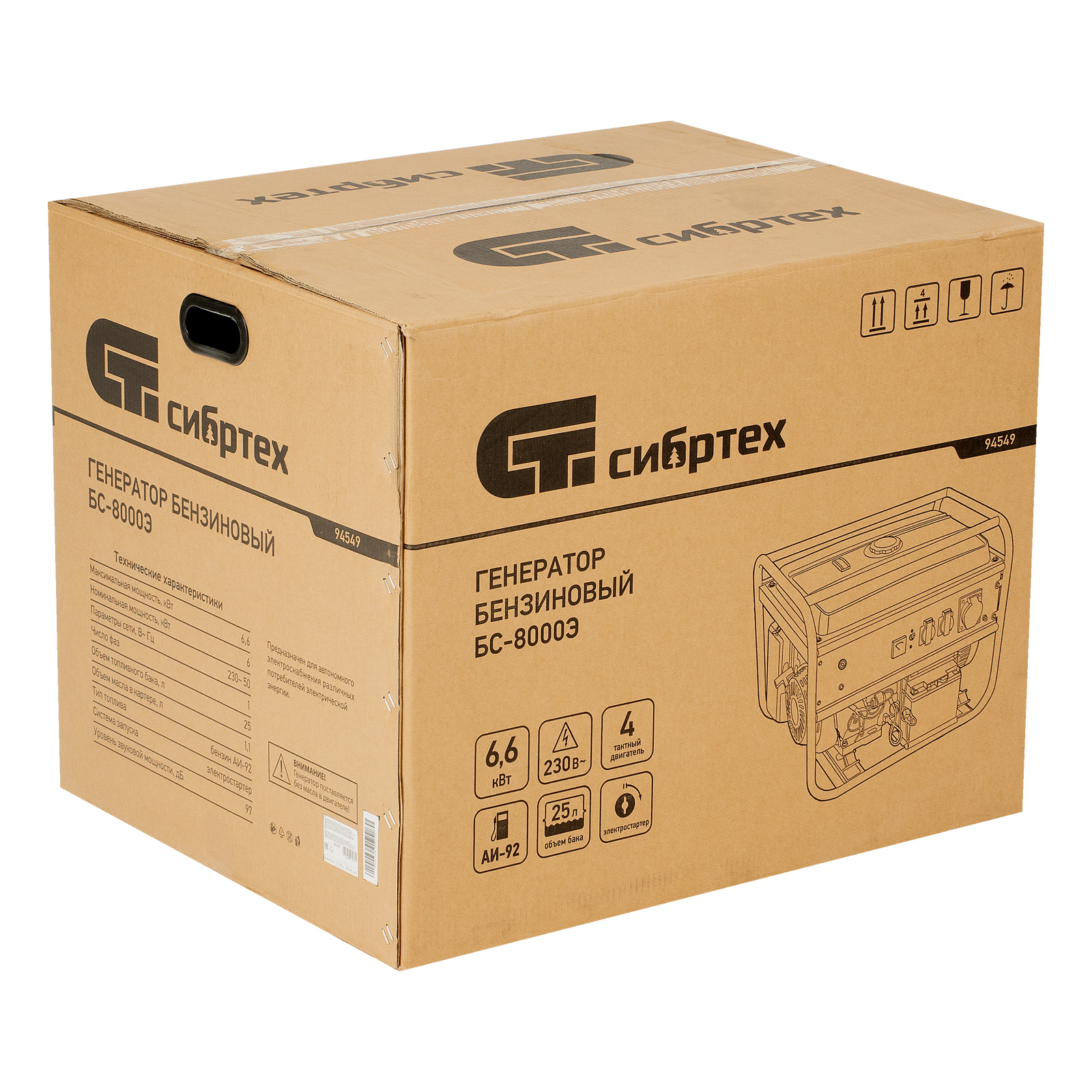 Генератор бензиновый БС-8000Э, 6,6 кВт, 230В, четырехтактный, 25 л, электростартер Сибртех в Екатеринбурге