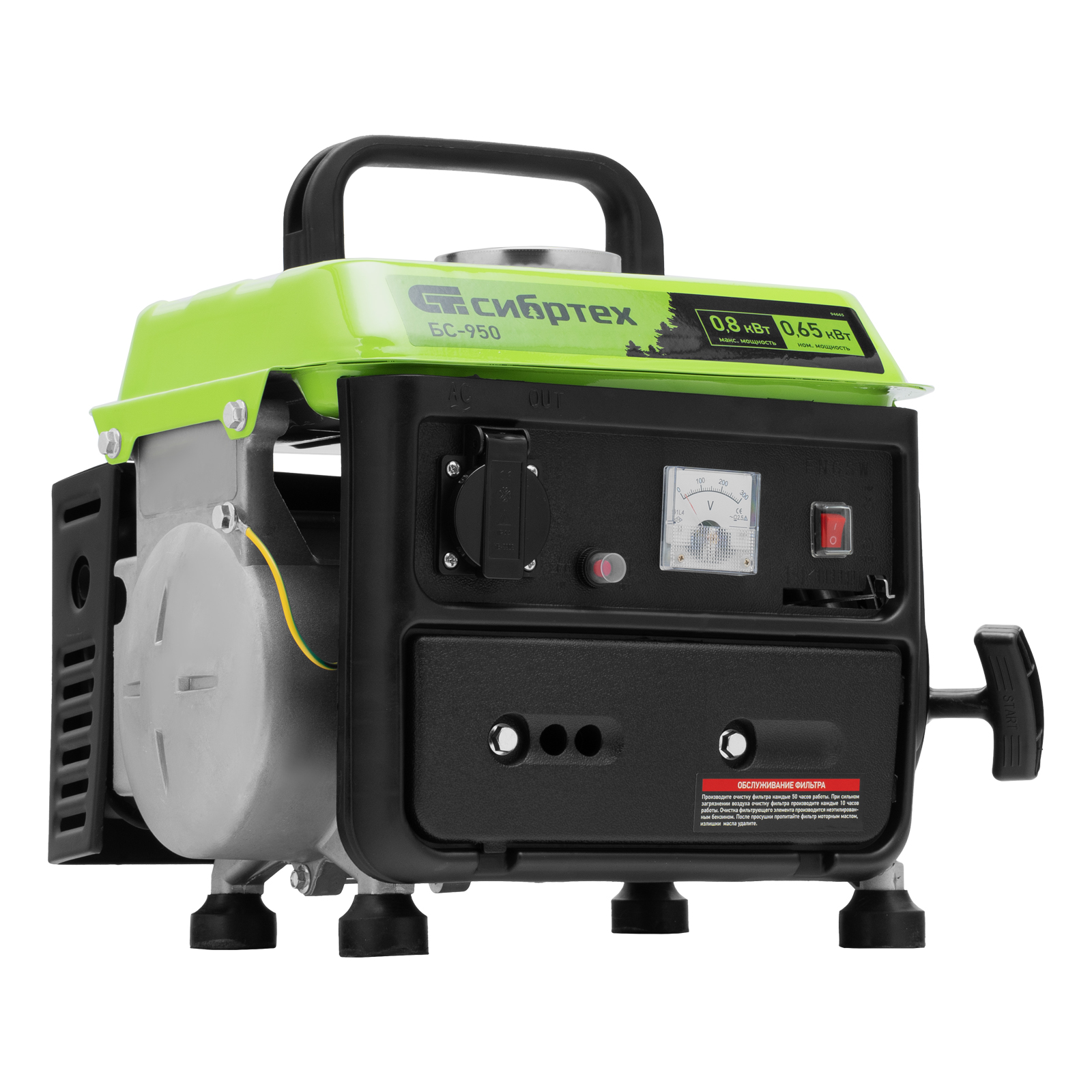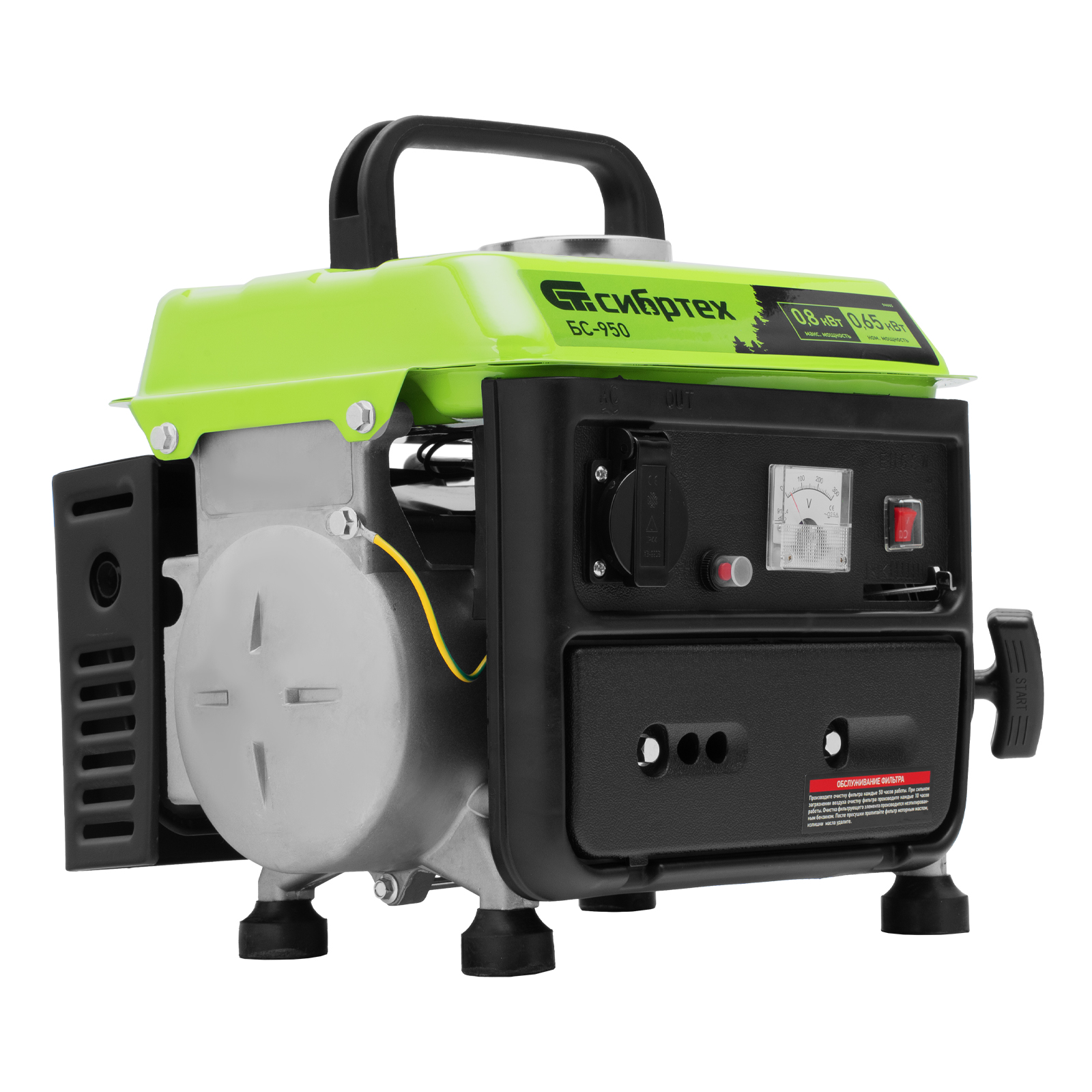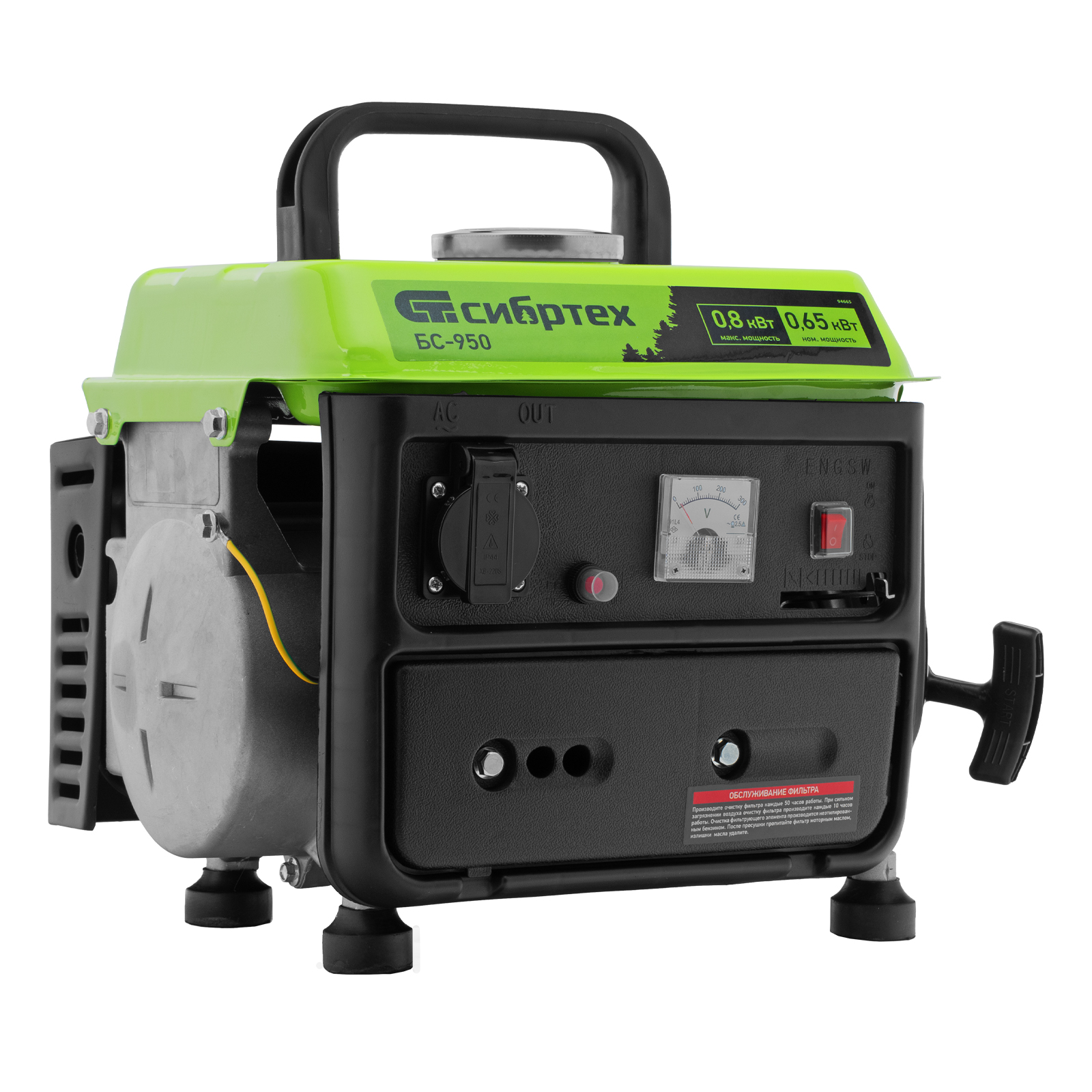 Бензиновый генератор Сибртех БС-950 94665 на 230 В, мощностью 0,8 кВТ, с 2-тактным двигателем и ручным стартером, с баком объемом 4 л, отличается небольшими габаритами, что делает его незаменимым на природе, на рыбалке, на даче или в гараже. Мощности 0,8 кВт достаточно для подключения электроинструмента или приборов с небольшим уровнем потребления энергии. На одной заправке генератор способен проработать до 4 часов.