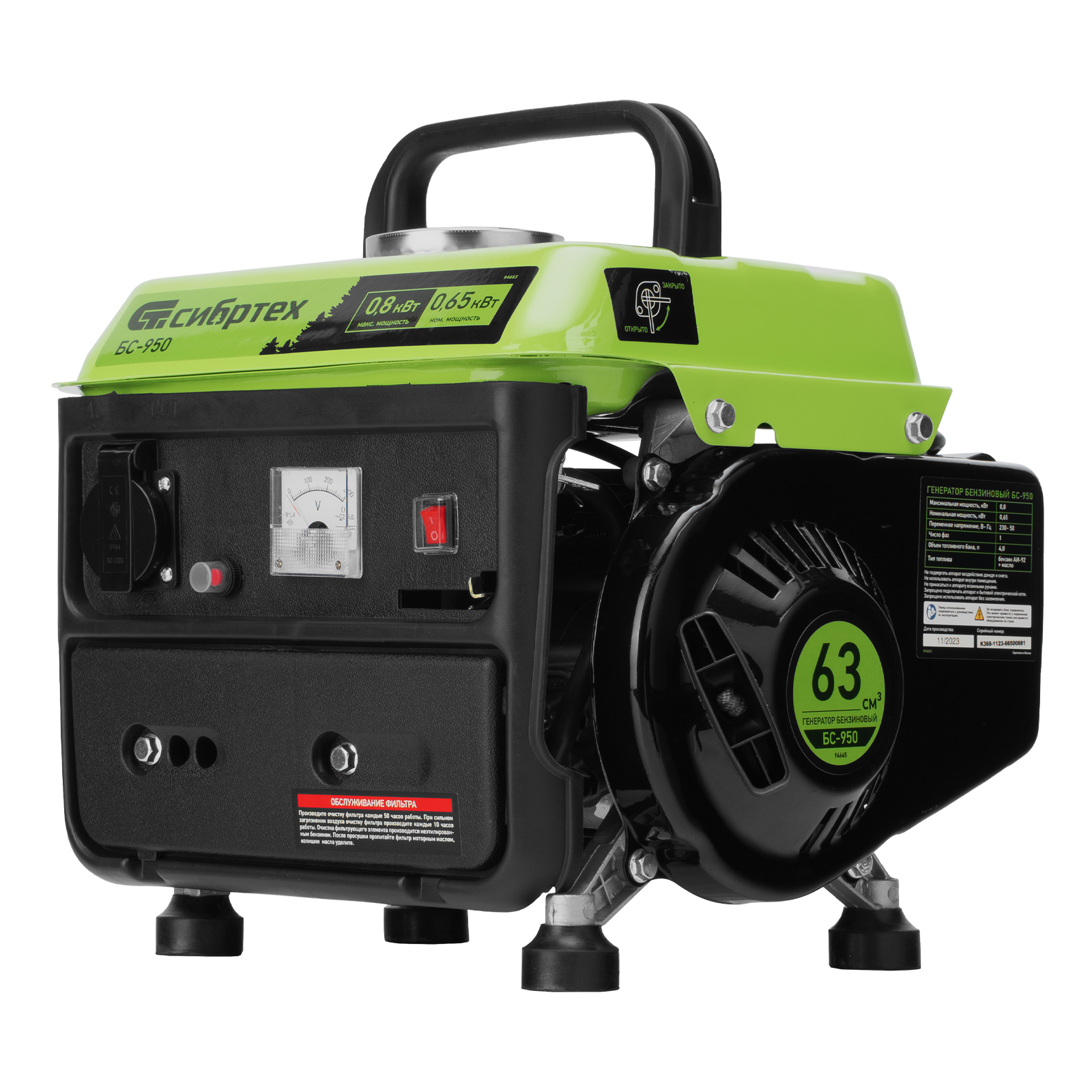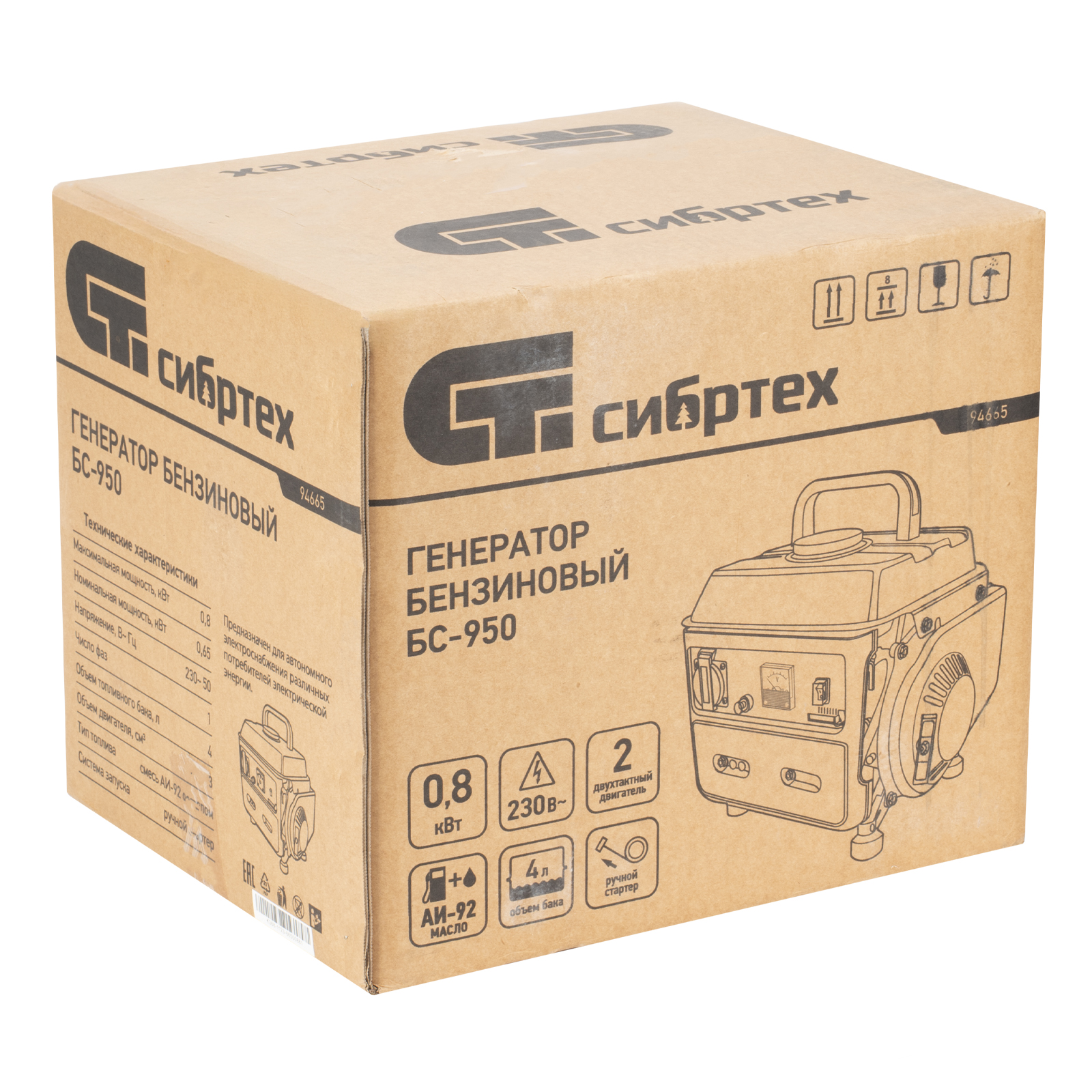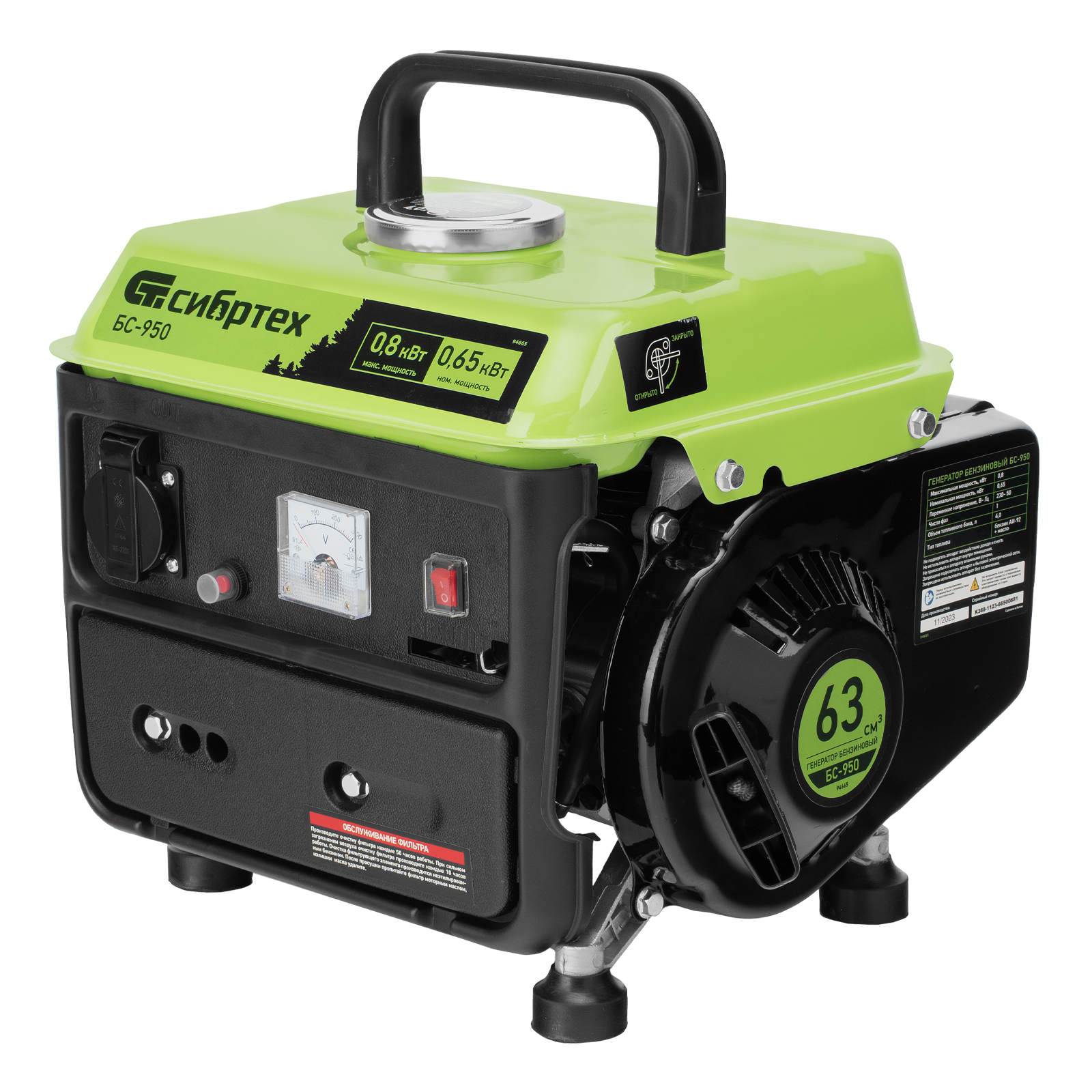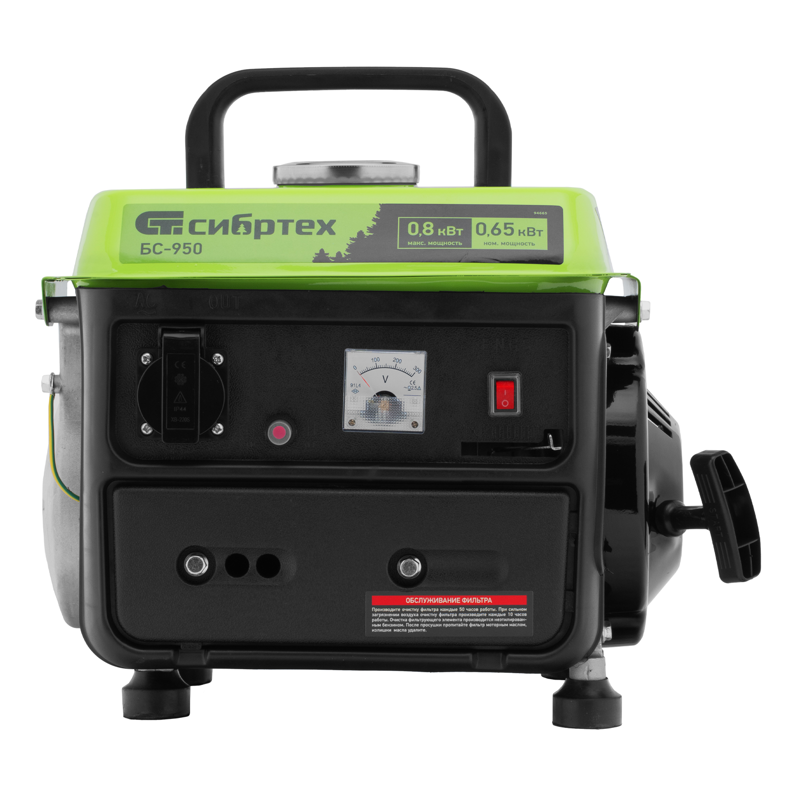 Бензиновый генератор Сибртех БС-950 94665 на 230 В, мощностью 0,8 кВТ, с 2-тактным двигателем и ручным стартером, с баком объемом 4 л, отличается небольшими габаритами, что делает его незаменимым на природе, на рыбалке, на даче или в гараже. Мощности 0,8 кВт достаточно для подключения электроинструмента или приборов с небольшим уровнем потребления энергии. На одной заправке генератор способен проработать до 4 часов.