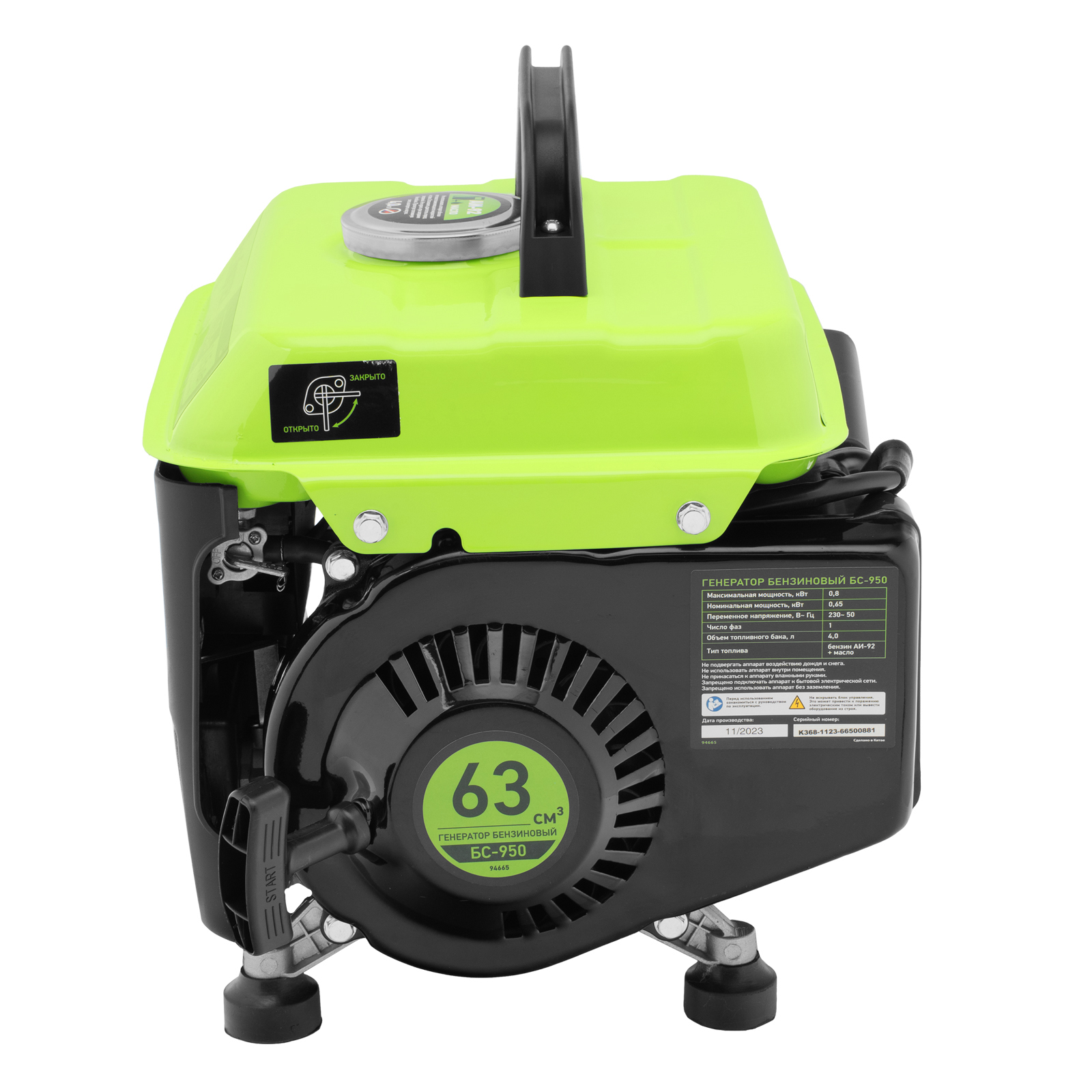 Генератор бензиновый БС-950, 0.8 кВт, 230 В, 2-х тактный, 4 л, ручной стартер Сибртех в Екатеринбурге