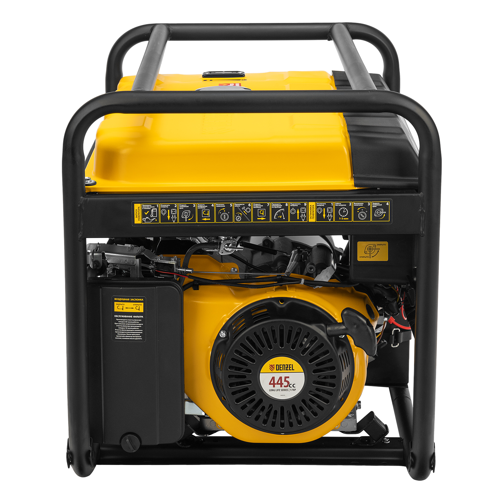 Благодаря увеличенному топливному баку генератор способен работать более 7 часов без дозаправки. Индикатор уровня топлива подскажет, когда следует наполнить бак. Обновленный четырехтактный бензиновый двигатель Denzel Long Life объемом 445 см3 обеспечивает стабильную работу генератора в течение длительного времени. При подключении блока автоматического управления Energomatic PS 115 (артикул 946714, приобретается отдельно) генератор самостоятельно запускается при отсутствии электричества, участие пользователя не требуется.