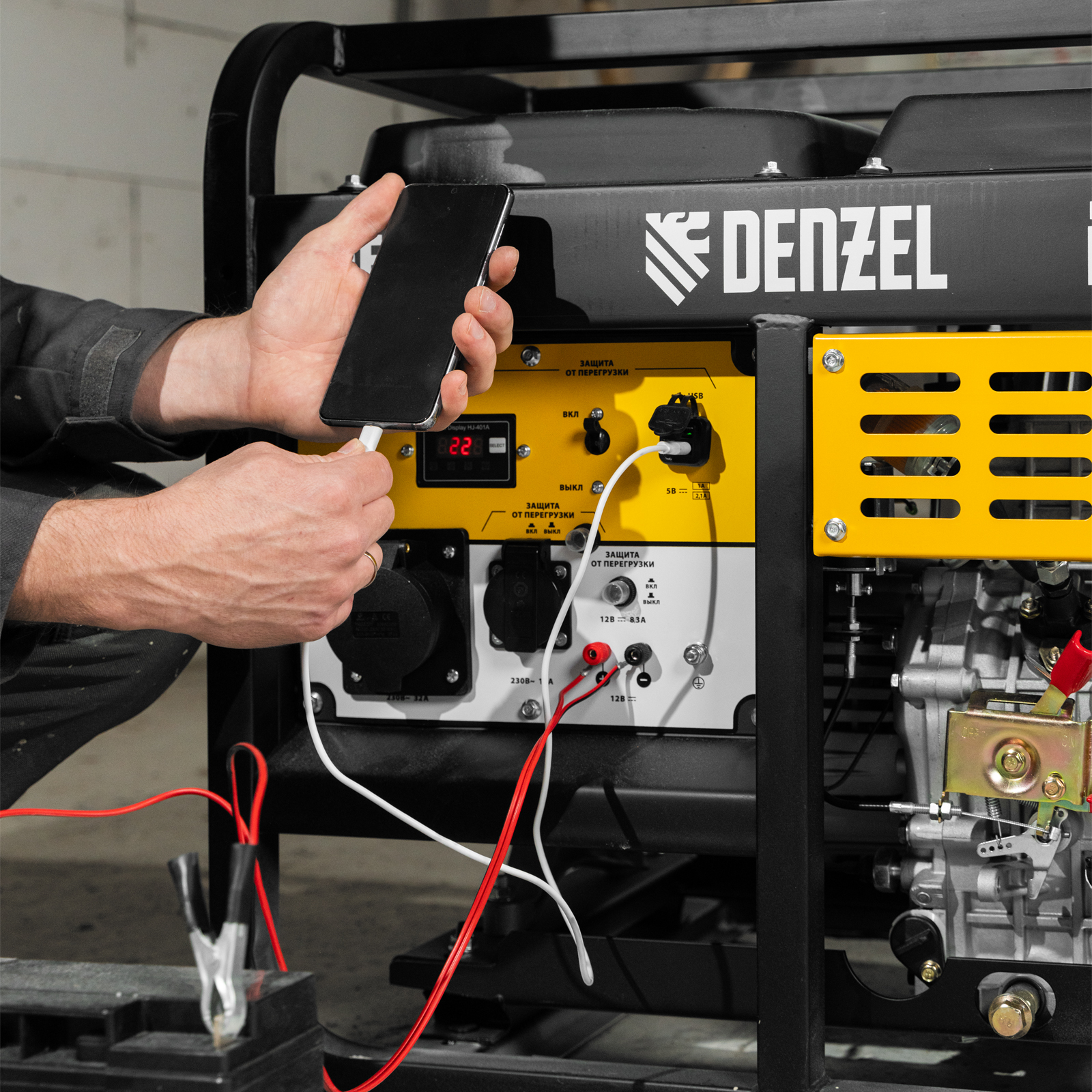 Генератор дизельный Denzel DES-55 94413 с объемом топливного бака 11 л, с ручным стартером, имеет максимальную выходную мощность 5,5 кВт и поддерживает напряжение в сети 230 В. Используется для снабжения энергией потребителей однофазного тока (осветительных приборов, бытовой техники, электроинструмента) при отсутствии доступа к стационарному источнику питания. Для подключения электроприборов служат 2 розетки: 230 В/16 А и 230 В/32 А. Клеммы постоянного тока 12 В позволяют заряжать автомобильные аккумуляторы, а двойной выход USB 5 В предназначен для подключения мобильных устройств (планшетов, смартфонов и т. д.). Генератор пригодится на строительной площадке и в загородном доме.