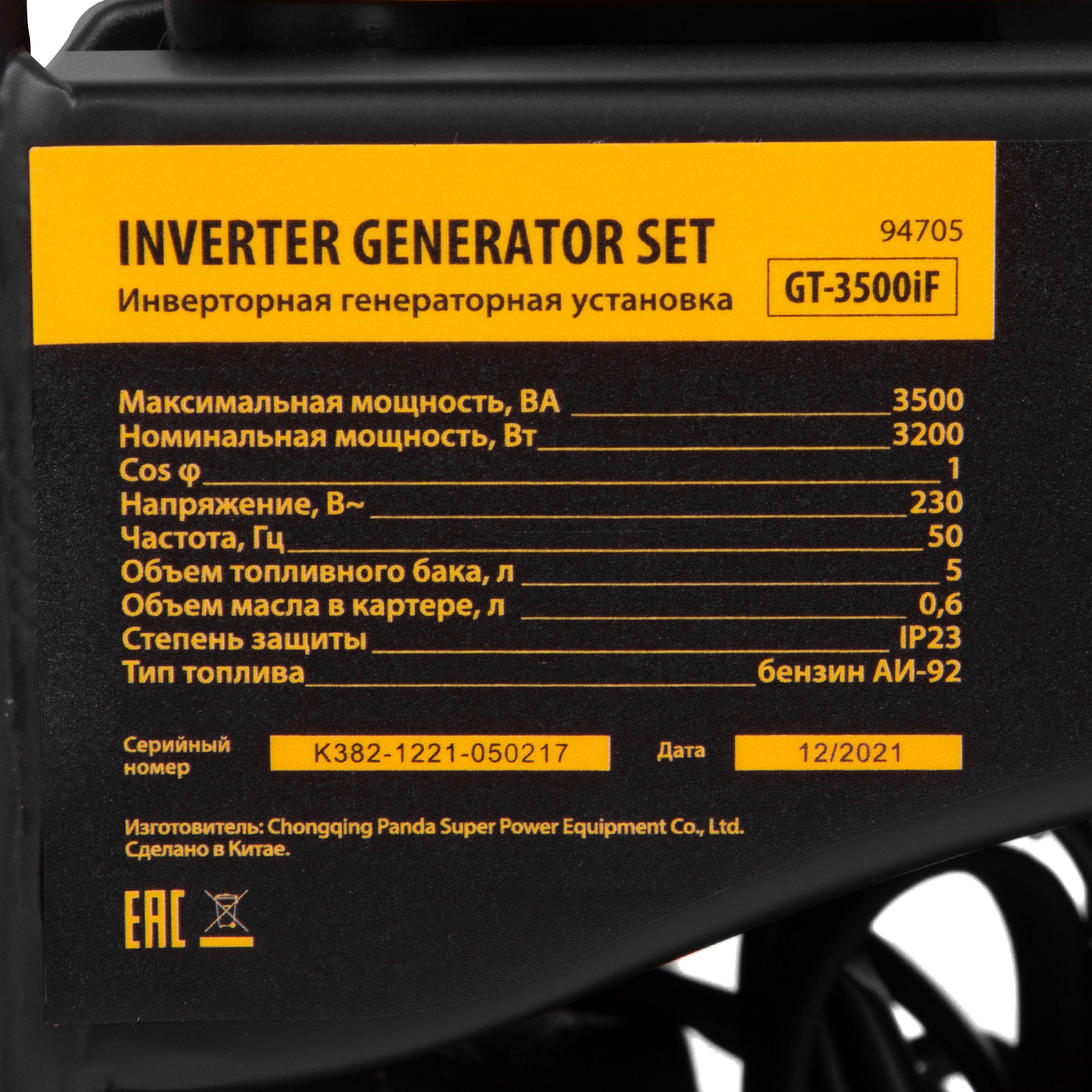 Генератор инверторный GT-3500iF, 3.5 кВт, 230 В, бак 5 л, открытый корпус, ручной старт Denzel в Екатеринбурге