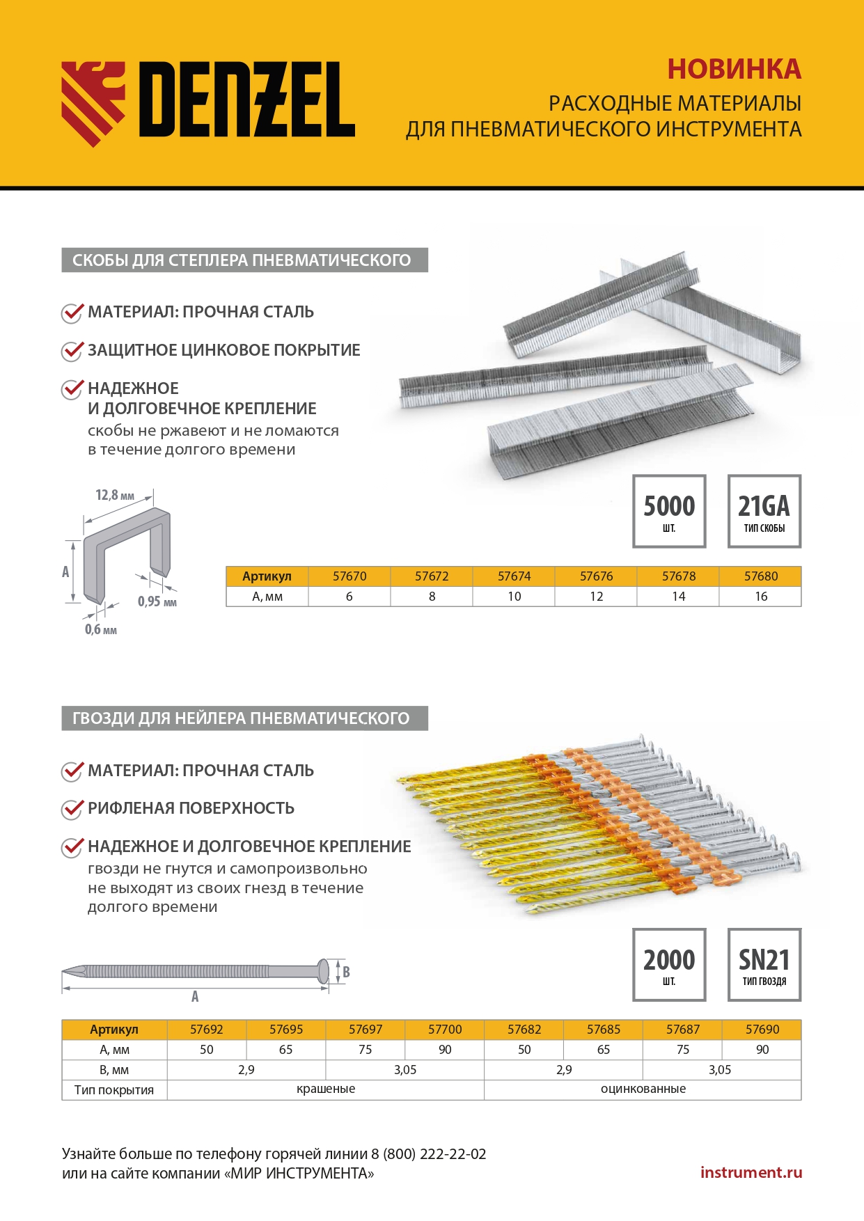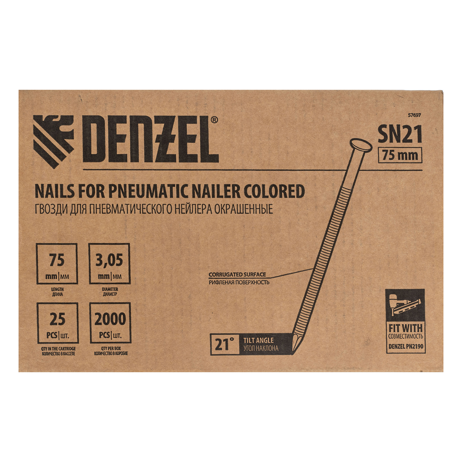 Гвозди Denzel 57697 типа SN21, длиной 75 мм и диаметром 3,05 мм, с крашеной поверхностью, 2000 шт. в упаковке, — расходники для пневматического нейлера. Используются для скрепления различных материалов, будут полезны во время сборочных и отделочных работ.