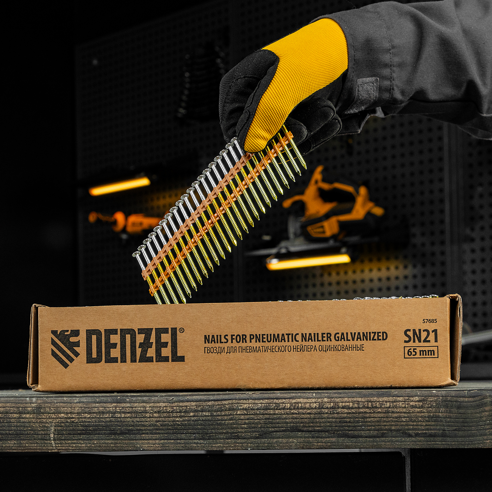 Оцинкованные гвозди Denzel 57685 типа SN21, длиной 65 мм и диаметром 2,9 мм, 2000 шт. в упаковке, — расходники для пневматического нейлера. Используются для скрепления различных материалов, будут полезны во время сборочных и отделочных работ.