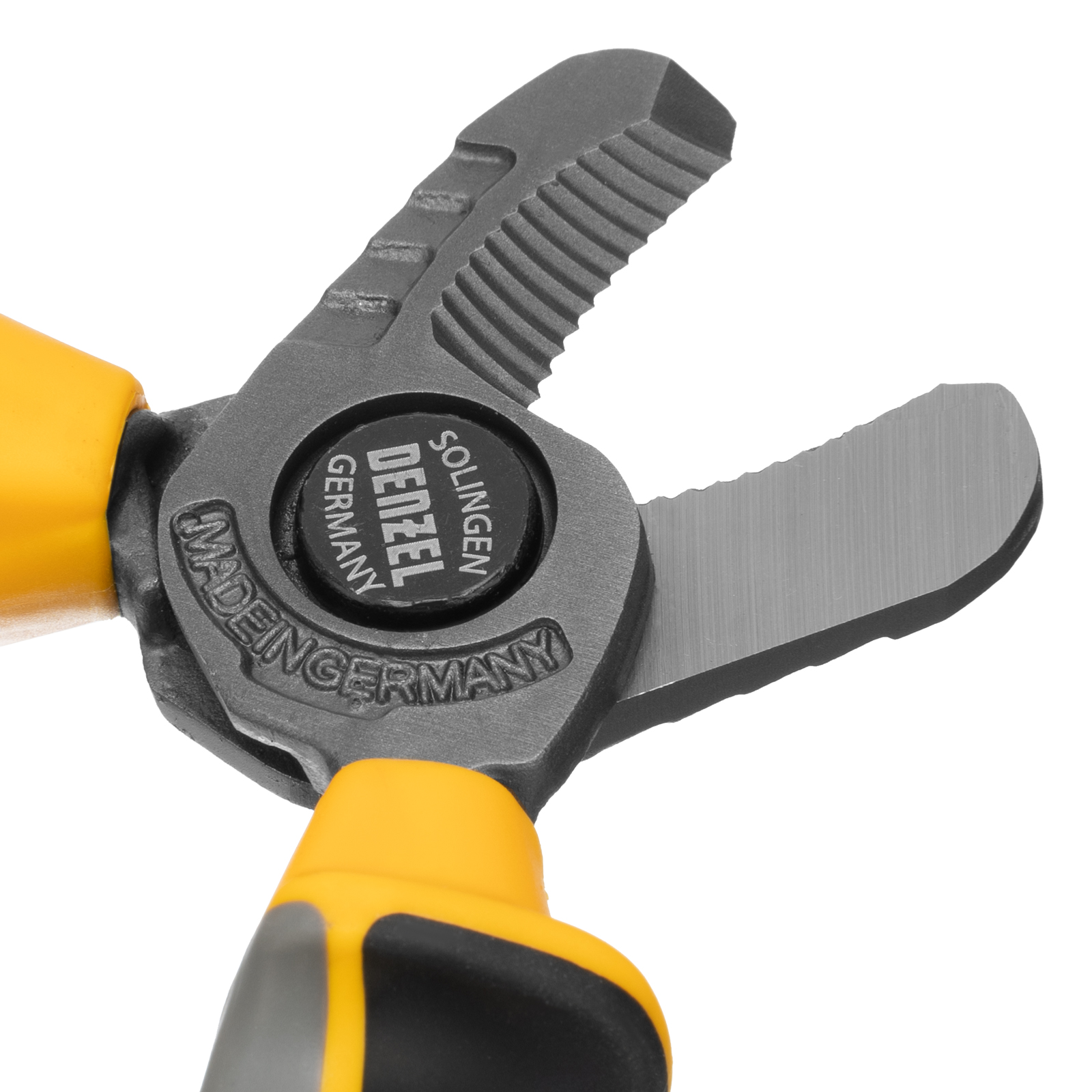 Кабелерез Denzel 17729 длиной 160 мм, с трехкомпонентными рукоятками, — инструмент для зачистки проводов и разрезания электрических кабелей. Способен перерезать кабель из алюминия и меди диаметром до 16 мм или сечением 50 кв. мм.