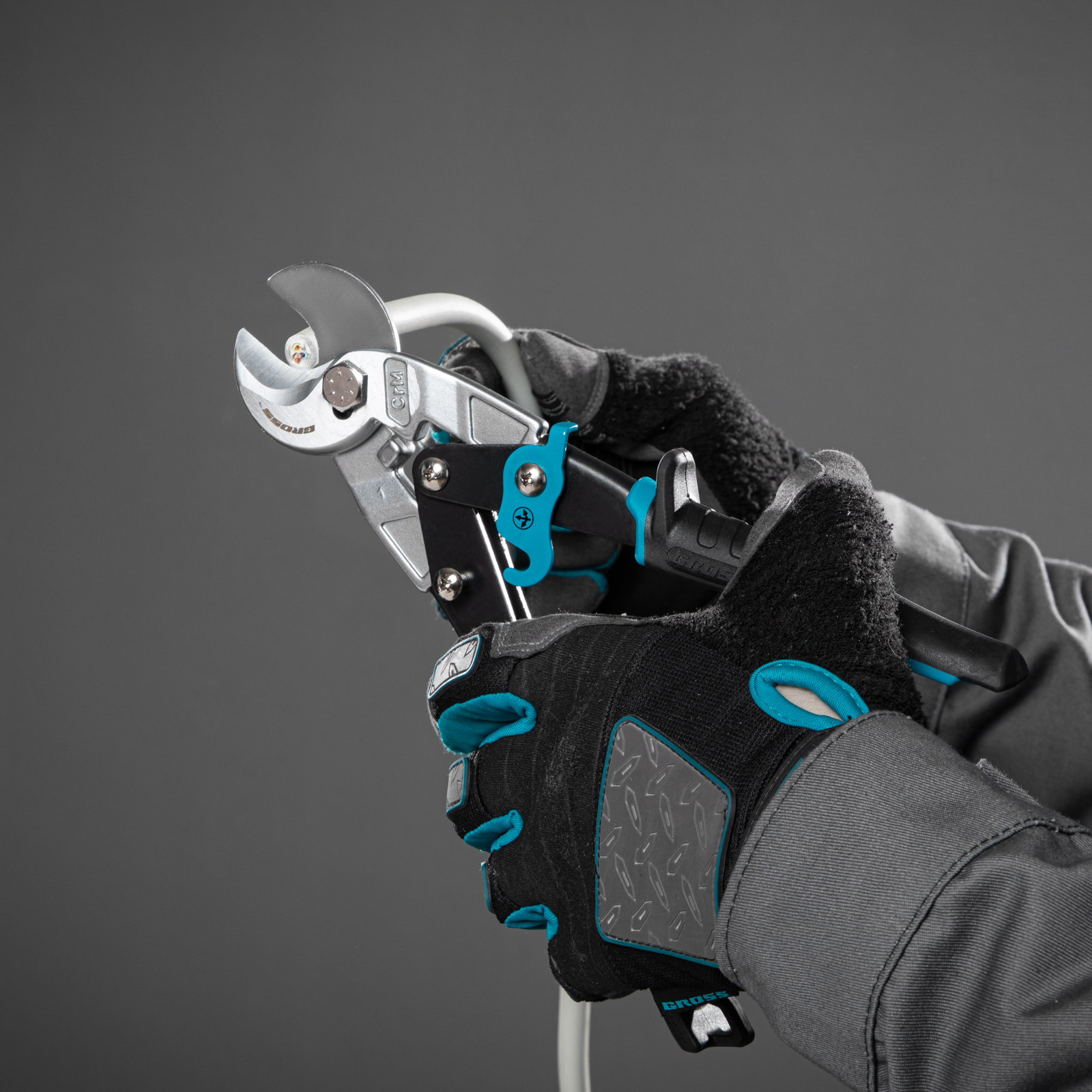 - Двойной рычажный механизм позволяет добиться высокой силы сжатия и сэкономить до 20% усилий при перерезании как алюминиевых, так и медных кабелей.