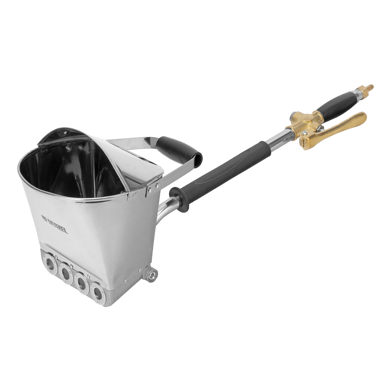 Хоппер-ковш Denzel HB1 57438 емкостью 4 л подключается к компрессору при помощи шланга с внутренним диаметром 10 мм и расходует 350 л сжатого воздуха в минуту. Используется для нанесения штукатурных растворов, позволяя ускорить выполнение отделочных работ и повысить их качество. 4 больших выходных сопла обеспечивают эффективное решение поставленных задач. Инструмент пригодится на строительной площадке.