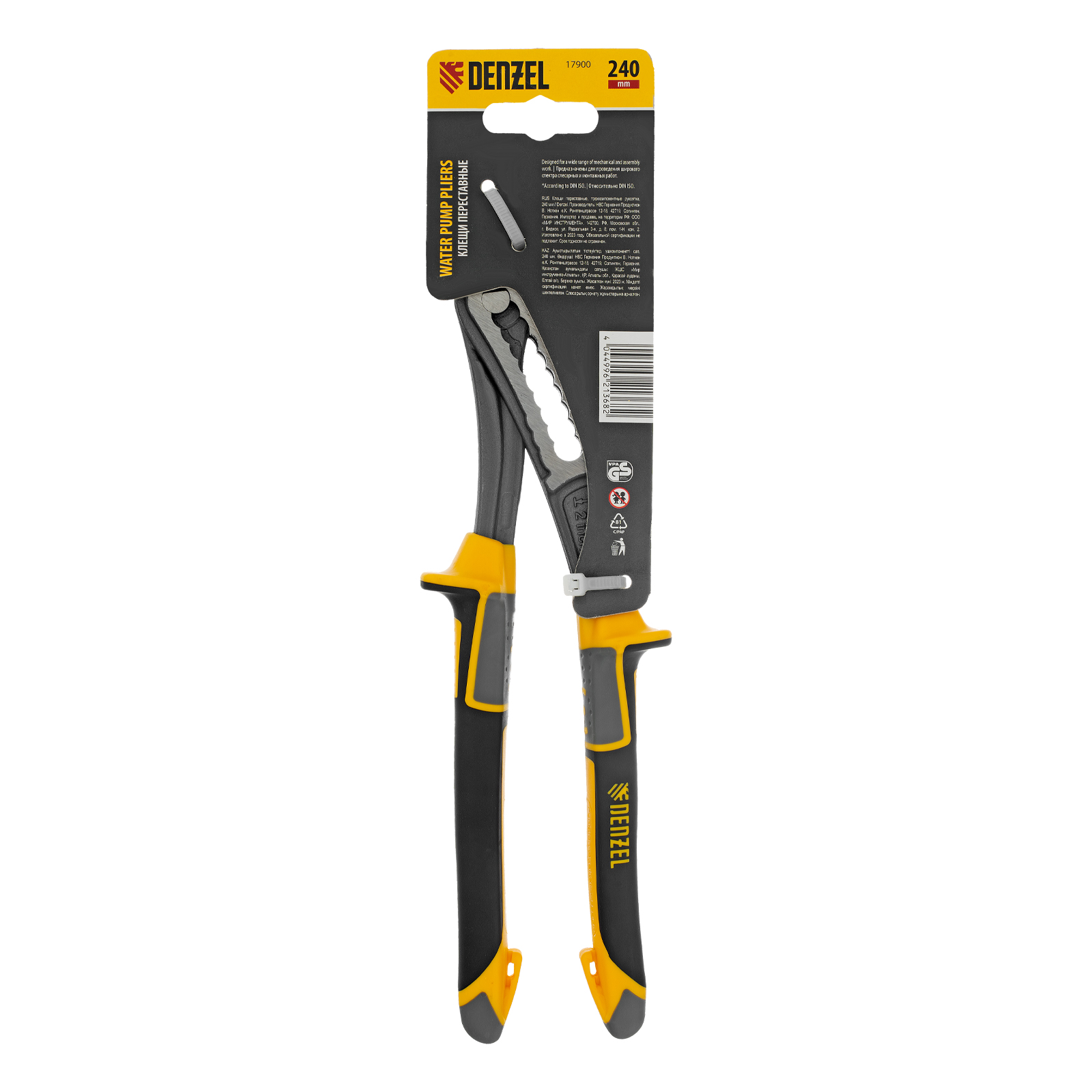 Переставные клещи Denzel 17900 длиной 240 мм, с трехкомпонентными рукоятками, предназначены для фиксации и вращения деталей и заготовок различной формы. Подходят для захвата фитингов, труб, крепежных элементов. Инструмент используется при проведении ремонтных, монтажных, сантехнических работ.
