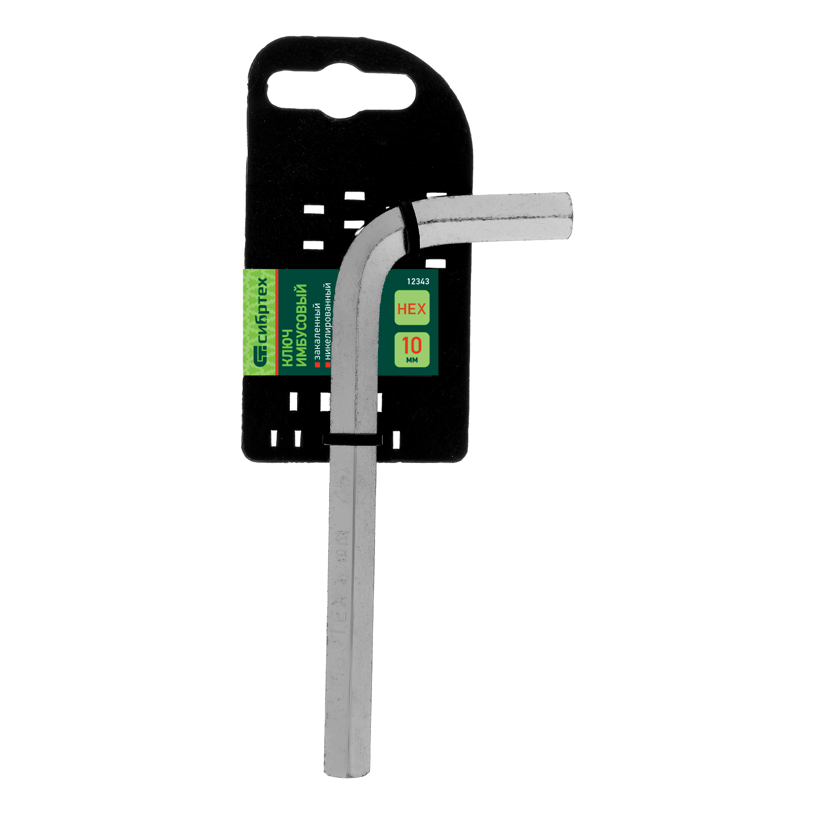 Ключ имбусовый никелированный Сибртех 12343 размером 10 мм, из закаленной стали 45Х, используется для монтажа и демонтажа резьбового крепежа с шестигранным шлицем HEX. Пригодится для сборки мебели, ремонта бытовой техники, велосипедов и автомобилей.