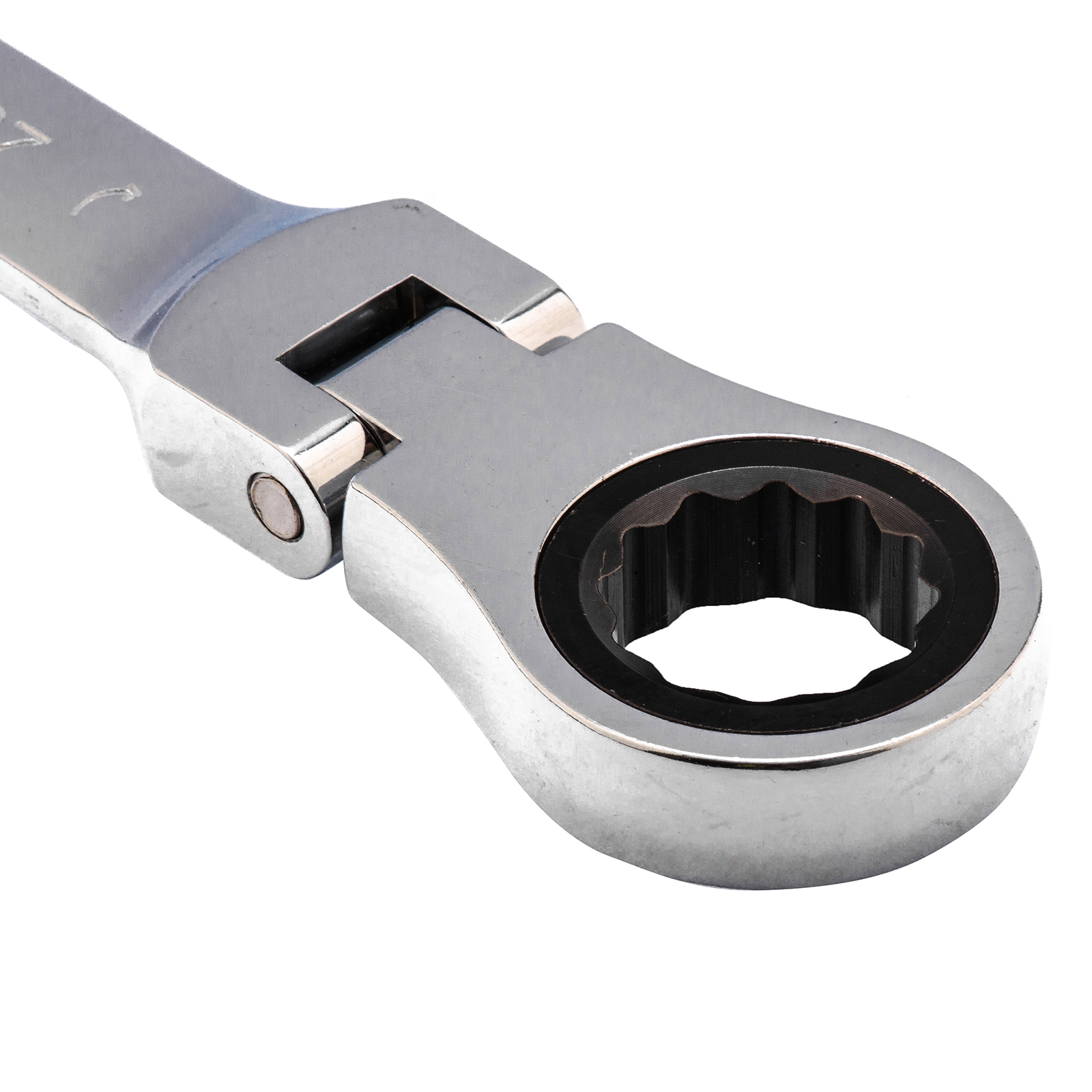 - Удобная работа в труднодоступных местах — храповой механизм на 72 зуба обеспечивает плавное вращение (шаг трещотки составляет 5°), а шарнир позволяет поворачивать рабочую часть под углом.