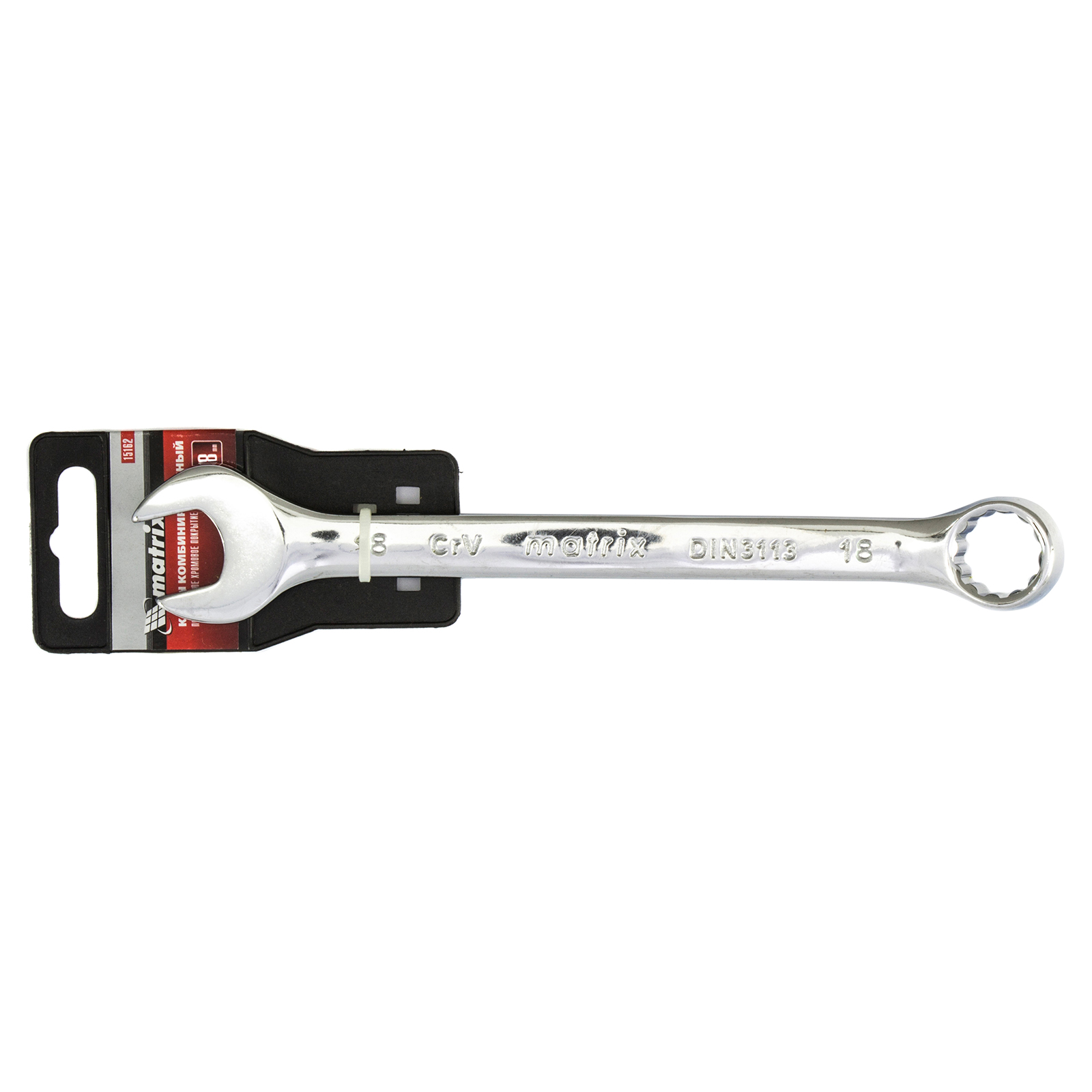 Комбинированный ключ Matrix 15162 размером 18 мм, из стали CrV, с покрытием «полированный хром», пригодится во время ремонтных работ дома или в гараже. С его помощью можно быстро монтировать и демонтировать крепежные элементы. Угол наклона кольцевого зева относительно плоскости инструмента составляет 15°, поэтому ключом удобно работать в труднодоступных местах.