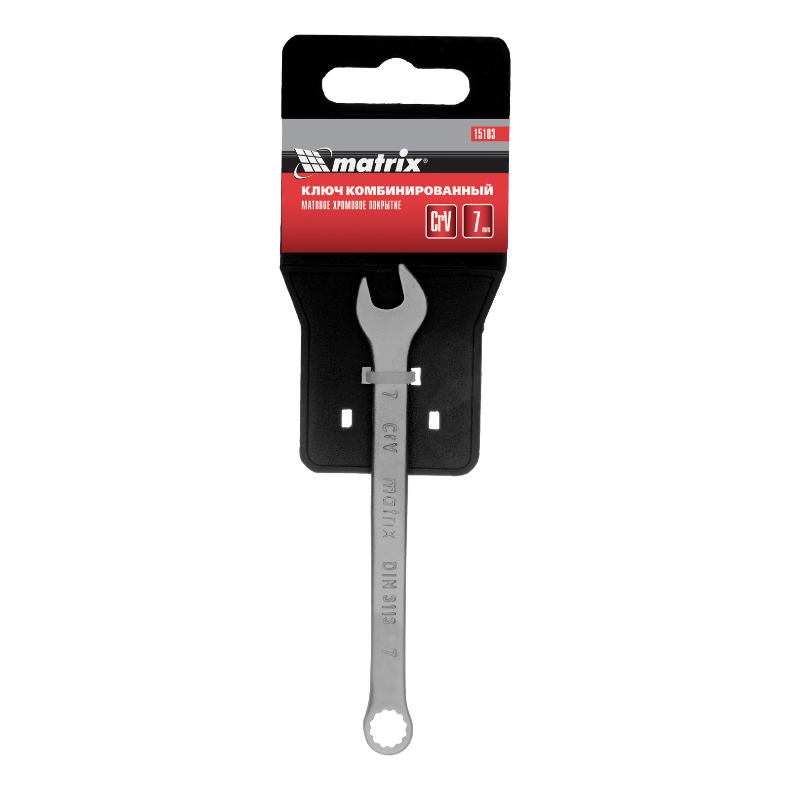 Комбинированный ключ Matrix 15103 размером 7 мм, из стали CrV, с покрытием «матовый хром», пригодится во время ремонтных работ дома или в гараже. С его помощью можно быстро монтировать и демонтировать крепежные элементы. Угол наклона кольцевого зева относительно плоскости инструмента составляет 15°, поэтому ключом удобно работать в труднодоступных местах.